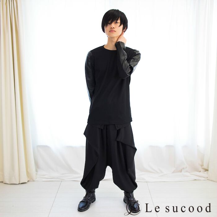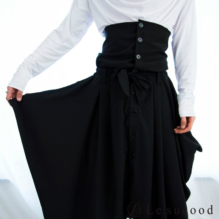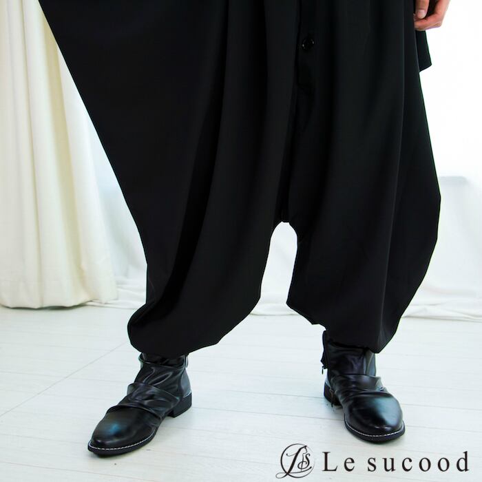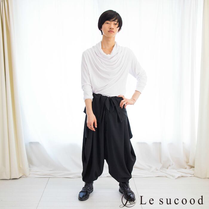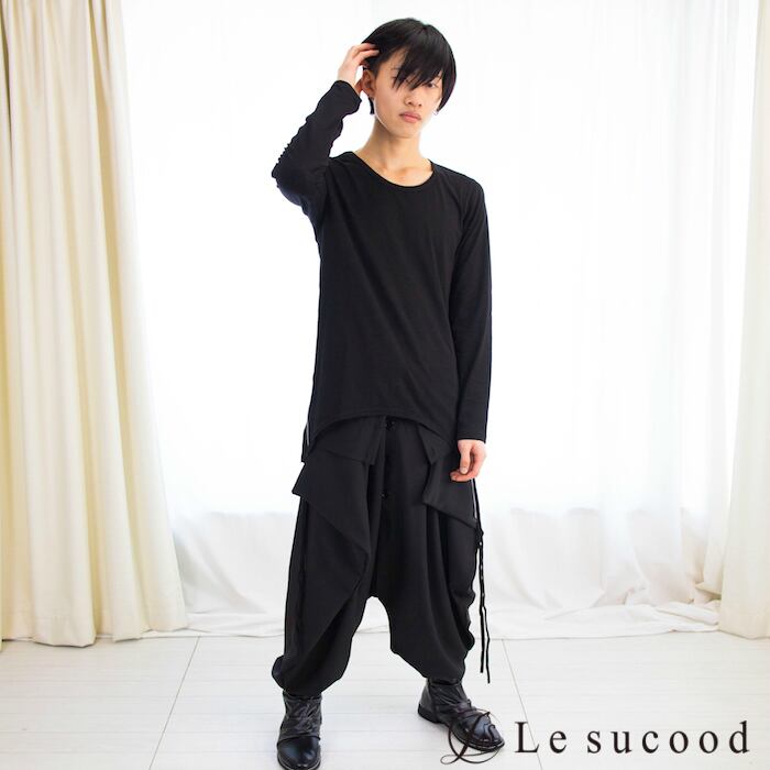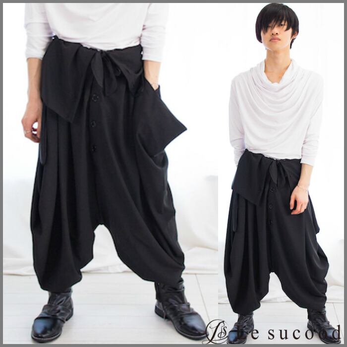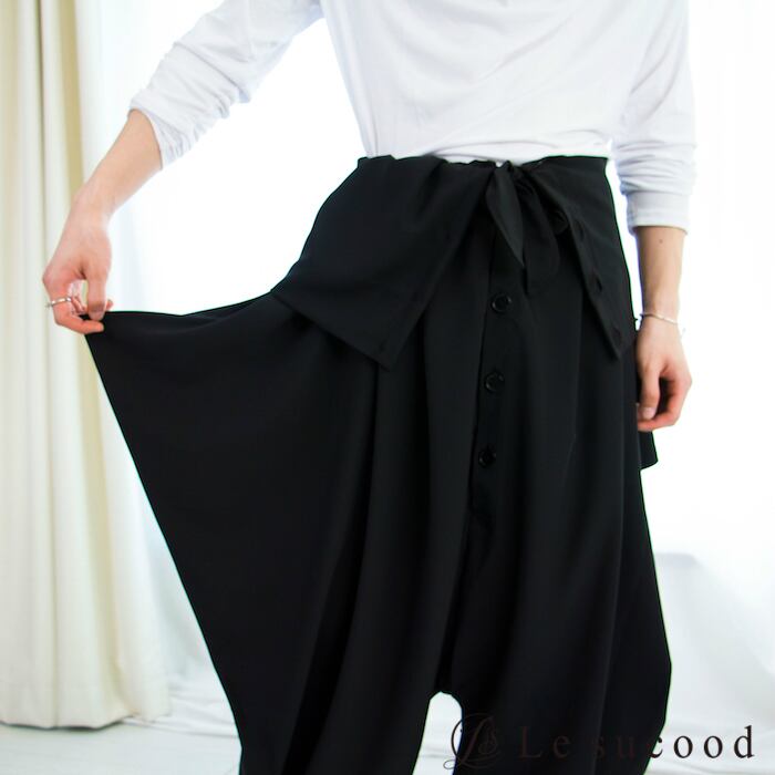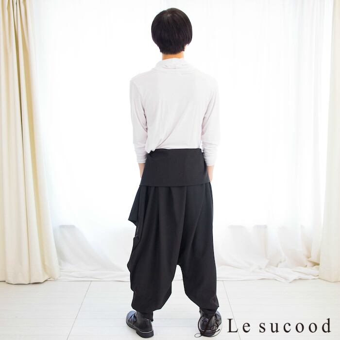 【Le sucood】【お支払い確認後20日以内発送】btm012 エプロン ハイウエスト バルーン サルエルパンツ 変形サルエルパンツ 袴パンツ はかまパンツ タイパンツ ボリュームパンツ リブ裾 ゆったり メンズ レディース ユニセックス 黒 ブラック モード系 ビジュアル系 ルシュクード