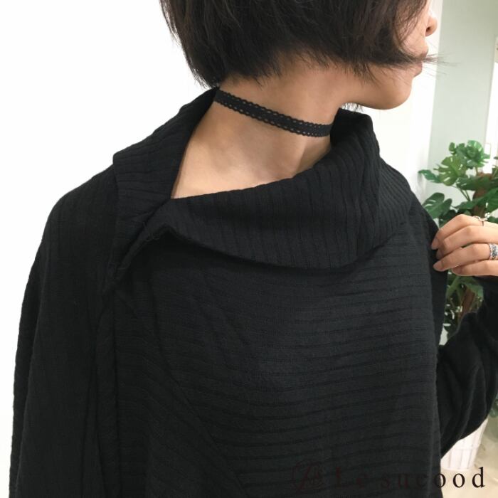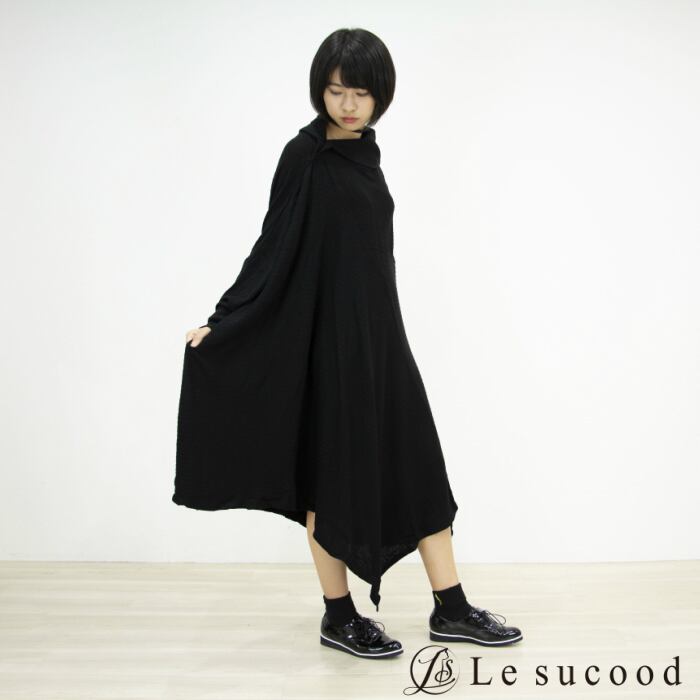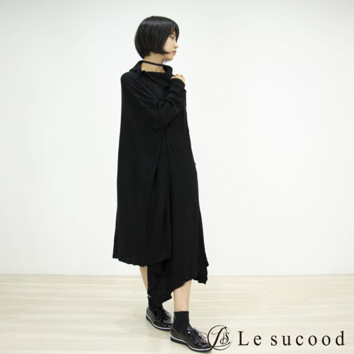 【Le sucood】top009 アシンメトリー ニット ワンピース モード ワントーン 黒 無地 レディース 大きいサイズ ハイネック タートルネック ビッグシルエット ロングワンピース 変形ワンピース フリーサイズ メンズ ビジュアル系 ルシュクード | Le sucood