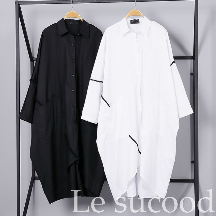 【Le sucood】【お支払い確認後20日以内発送】 top230 ロング シャツ ワンピース ドルマンシャツ シャツワンピ ビッグシルエット アシンメトリー モード 全二色 黒 白 レディース 無地 フリンジ 大きいサイズ ゆったり フリーサイズ コクーンシャツ