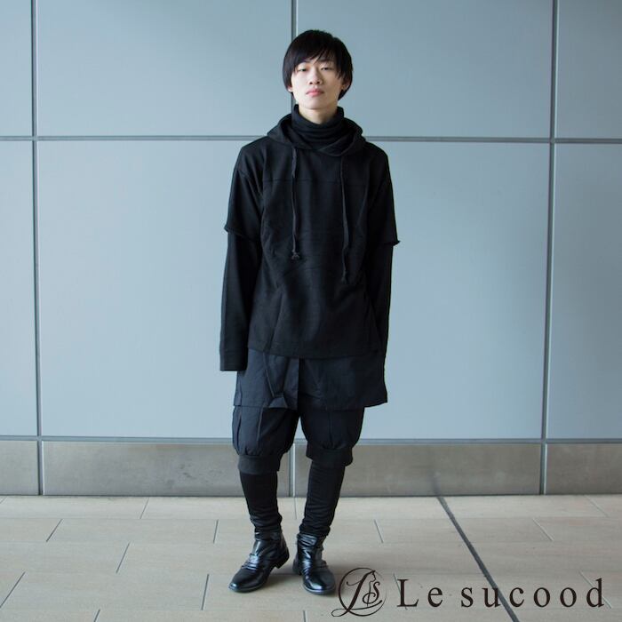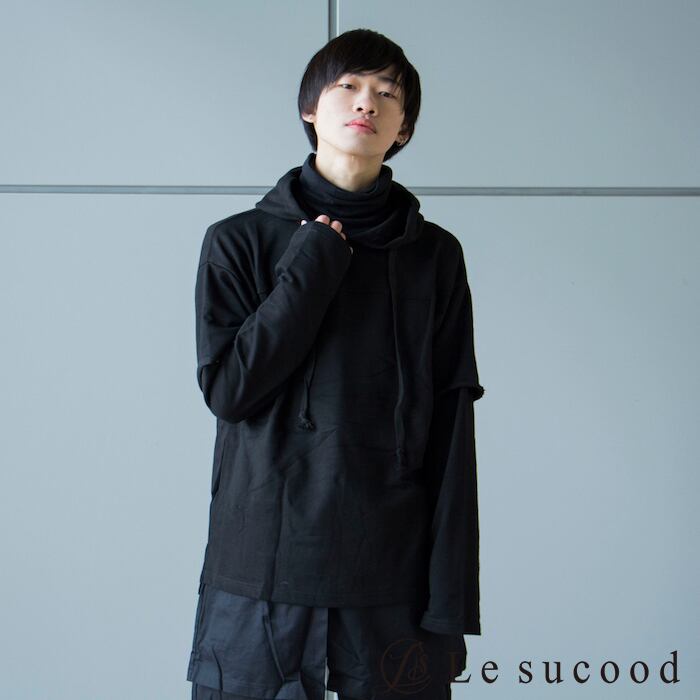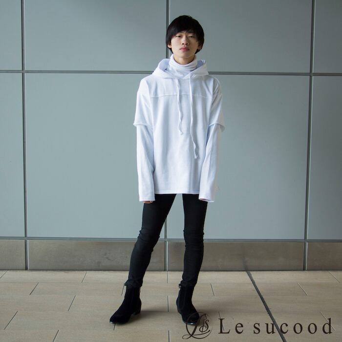 【Le sucood】top013 フェイク レイヤード パーカー タートルネック ハイネック アフガンネック ボリュームネック ロングパーカー ビッグシルエット プルオーバー 黒 白 2カラー 全二色 ブラック ホワイト モード系 ビジュアル系 ルシュクード | Le sucood