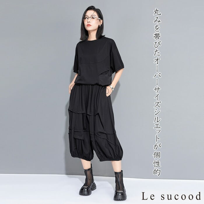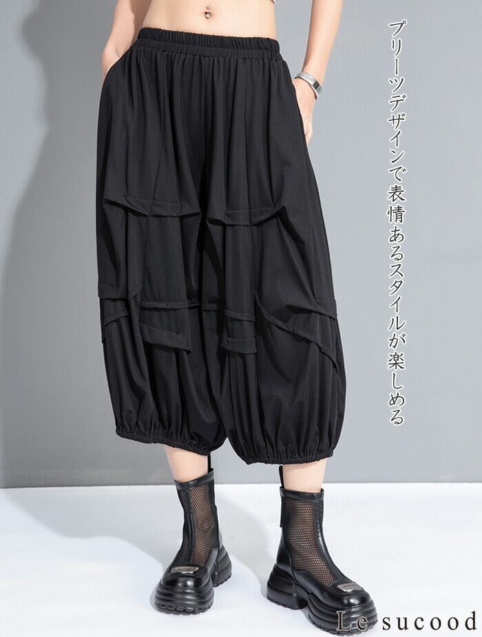 【お支払い確認後20日以内発送】Le sucood クロップドパンツ レディース ワイドパンツ 動きやすい ワイドレッグパンツ 7分丈 カジュアル ルーズパンツ 黒無地 デザインパンツ 半端丈パンツ バルーンパンツ オーバーサイズ モノトーン モード系 ストリート系 サロン系 個性的 原宿系 ファッション | Le sucood
