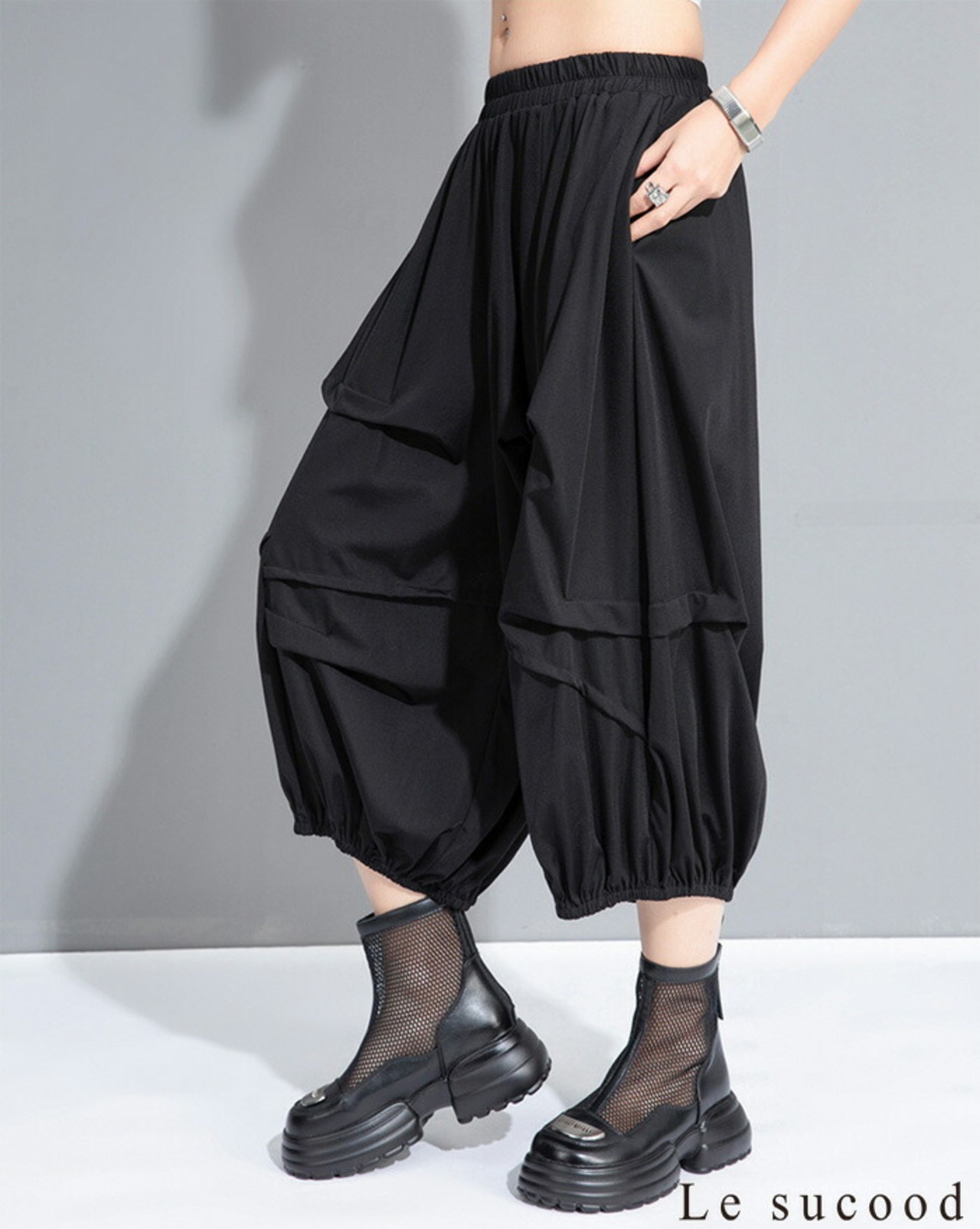 【お支払い確認後20日以内発送】Le sucood クロップドパンツ レディース ワイドパンツ 動きやすい ワイドレッグパンツ 7分丈 カジュアル ルーズパンツ 黒無地 デザインパンツ 半端丈パンツ バルーンパンツ オーバーサイズ モノトーン モード系 ストリート系 サロン系 個性的 原宿系 ファッション
