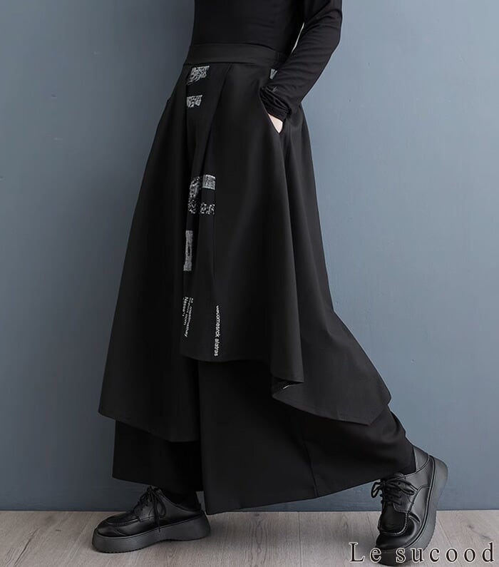 【お支払い確認後20日以内発送】Le sucood レイヤード スカートパンツ 秋冬 レディース 黒 モード系 ワイドレッグパンツ スカンツ ワイドパンツ オーバーサイズ ゆったり エプロンパンツ デザインパンツ ハイウエスト アシメスカート ストリート系 サロン系 個性的 原宿系 ファッション | Le sucood