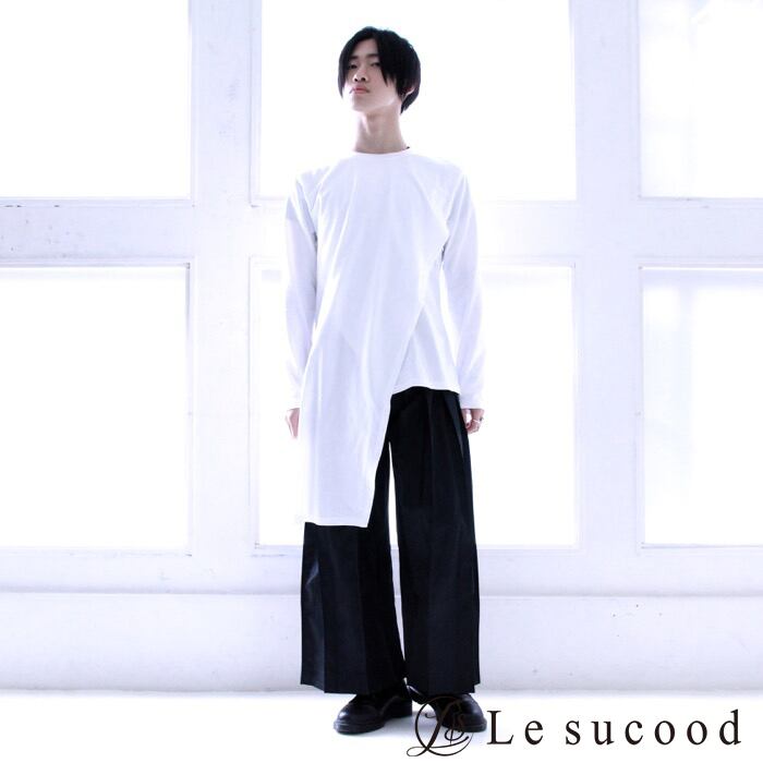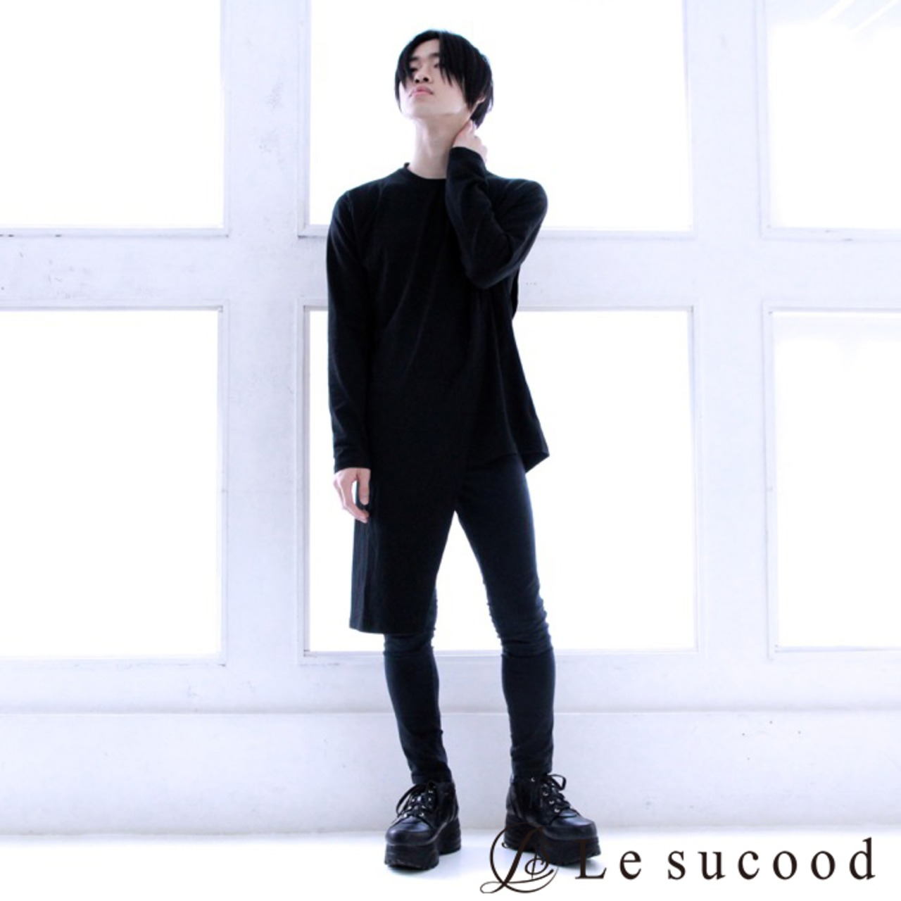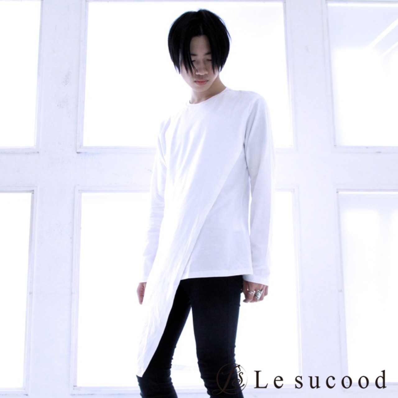 【Le sucood】【お支払い確認後20日以内発送】top042 フェイクレイヤードTシャツ 長袖 左右非対称 アシンメトリー アシメシャツ カットソー ワンピース風 トップス 春服 個性デザイン レディース メンズ ユニセックス 黒 白 フリーサイズ モード 大きいサイズ ストリートモード クルーネック アメカジ