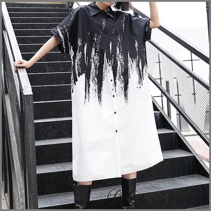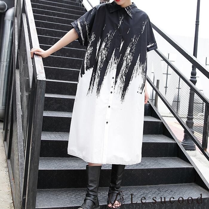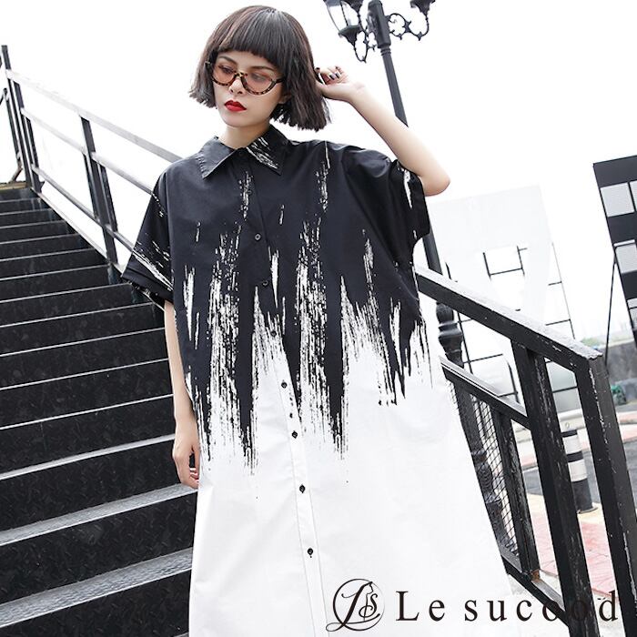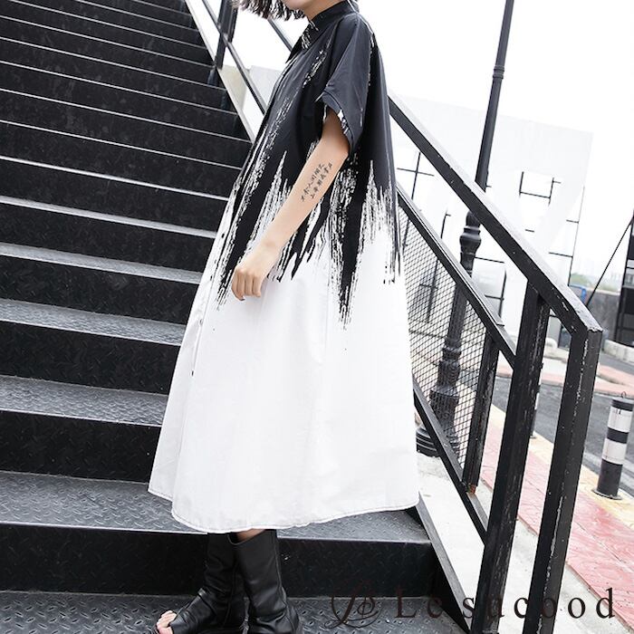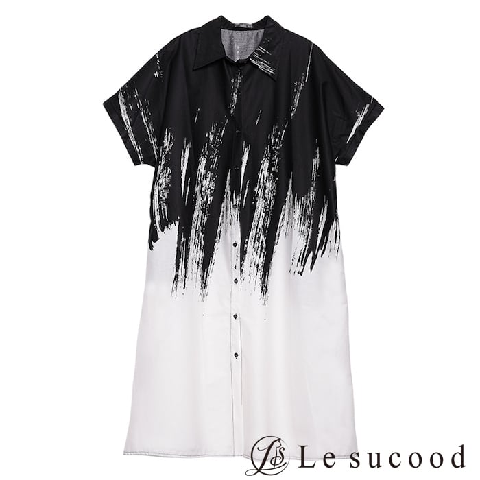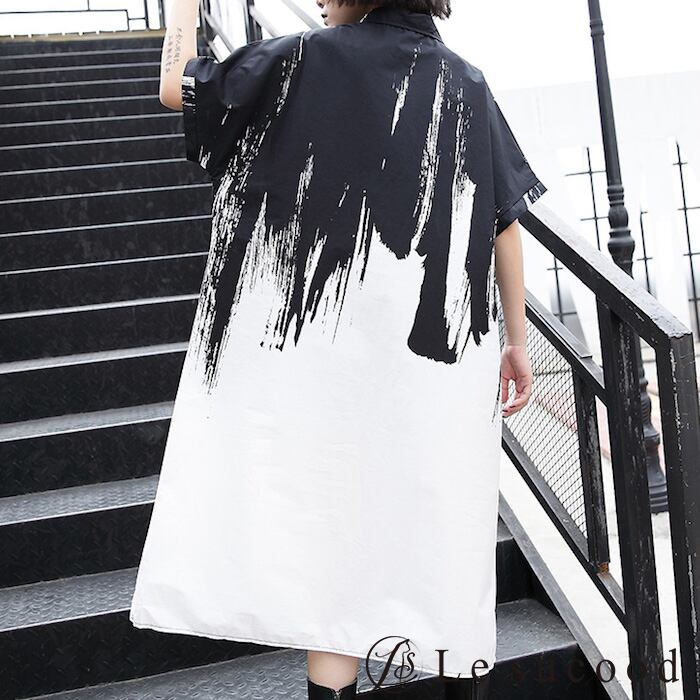 【Le sucood】top043 ペイントデザインシャツ 半袖 モノトーン バイカラー ツートン シャツワンピース シャツワンピ 和柄 メンズ レディース ロング丈 マキシ丈 モード コクーンシャツ フリーサイズ モノクロ ブラック ホワイト 春服 夏服 無地 ビッグシルエット 体型カバー