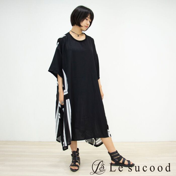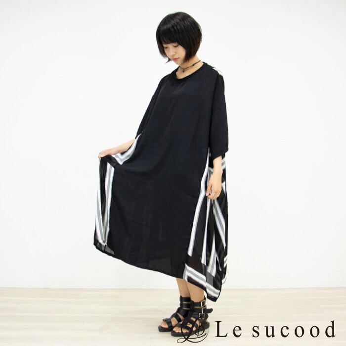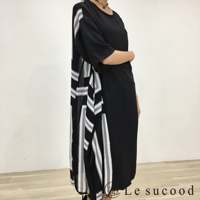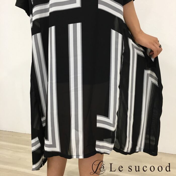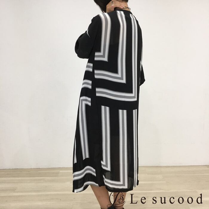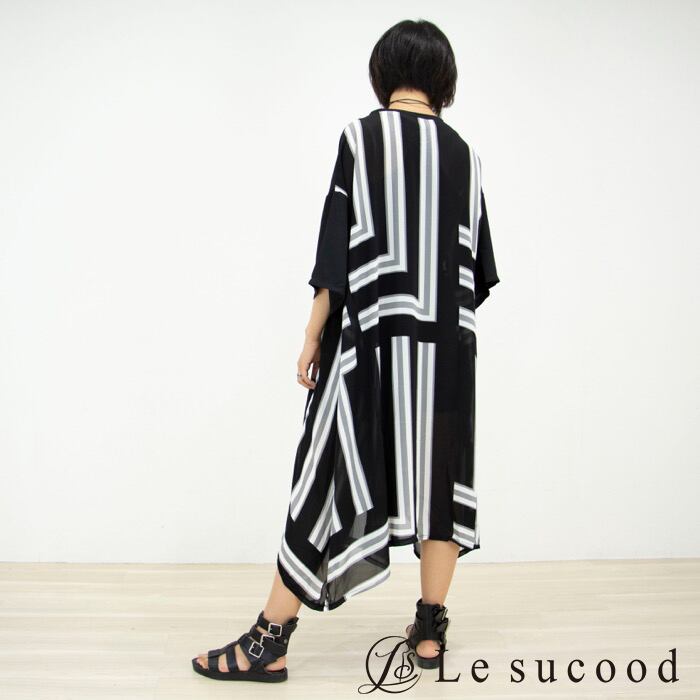 【Le sucood】top044 バックデザインワンピース シフォンワンピース 幾何学模様 幾何柄 ロング丈 ロングチュニック スカート ドロップショルダー モードスタイル オーバーサイズ モノトーン モード カジュアル Aライン 春服 夏服 フリーサイズ 大人可愛い ストライプ マタニティ