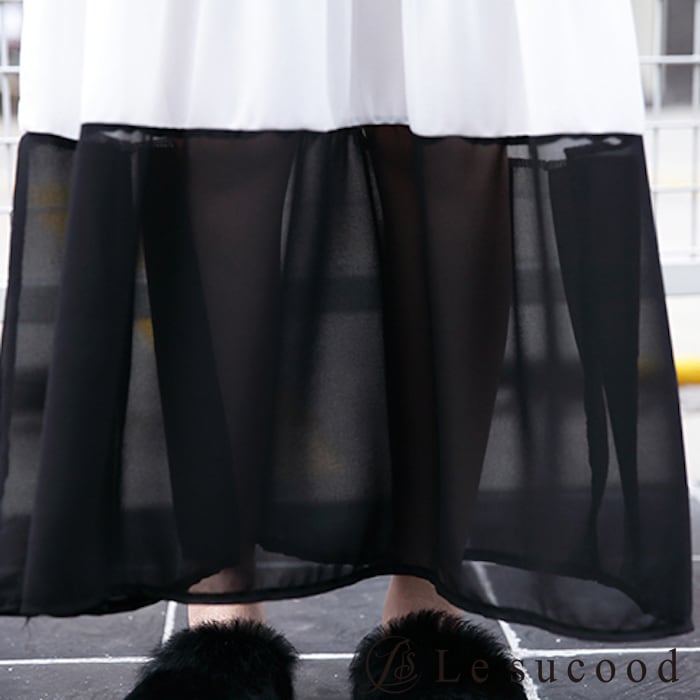【Le sucood】【お支払い確認後20日以内発送】シフォンワンピース ドレス ノースリーブ メッシュ スカート レーススカート ボーダー柄 チュニック ロング丈 マキシ丈 春服 夏服 レディース モード 大人モード ゆったり 大きいサイズ 薄手 ふんわり感