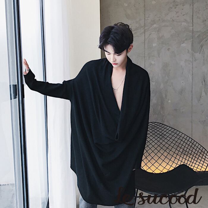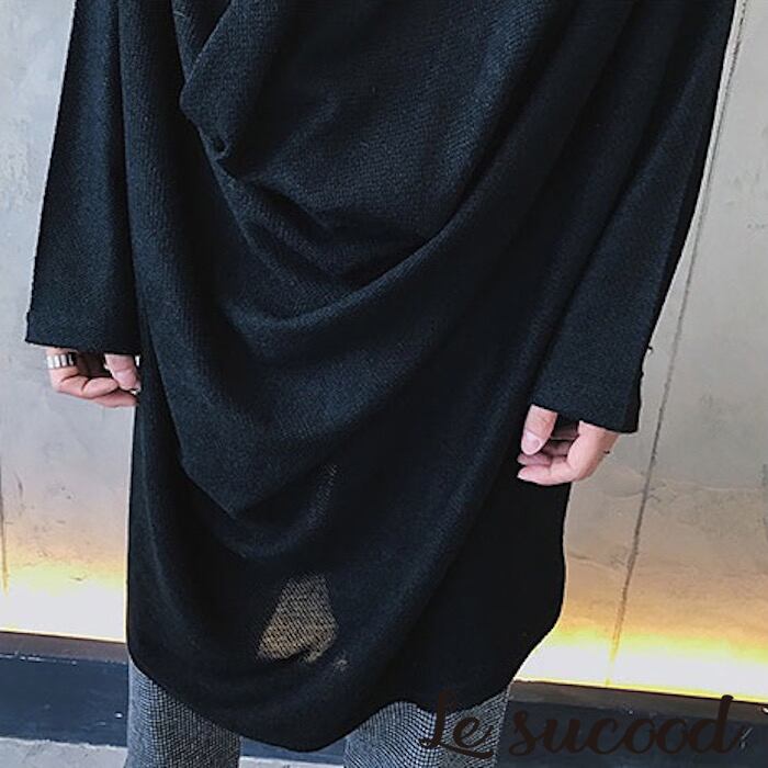 【Le sucood】ドレープロングシャツ モード系 きれいめ ロングシャツ ロング丈 無地 春服 夏服 カットソー Tシャツ 長袖 V系 メンズ レディース 黒 変形 マント ゆったり ゆる カウルネック 透け感 パンク シンプル ナチュラル
