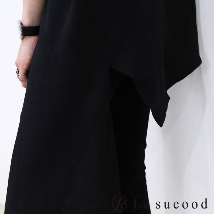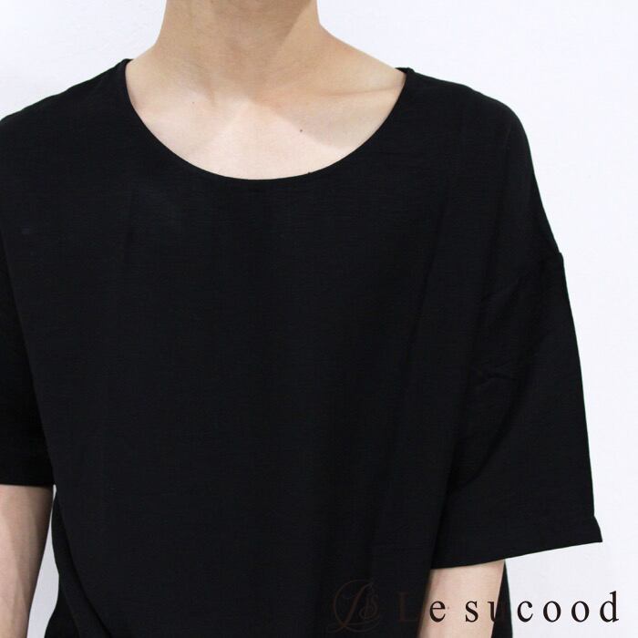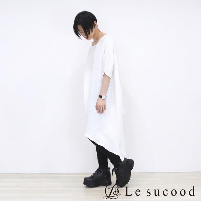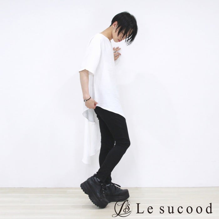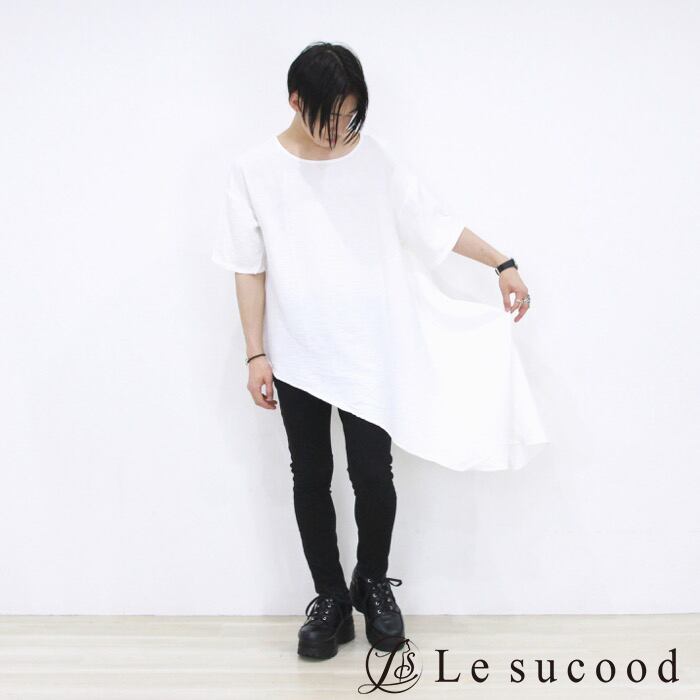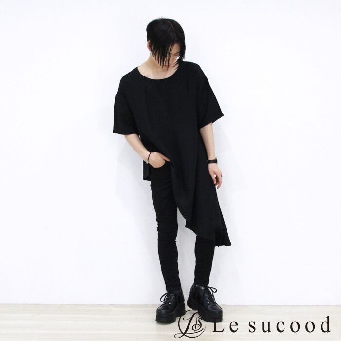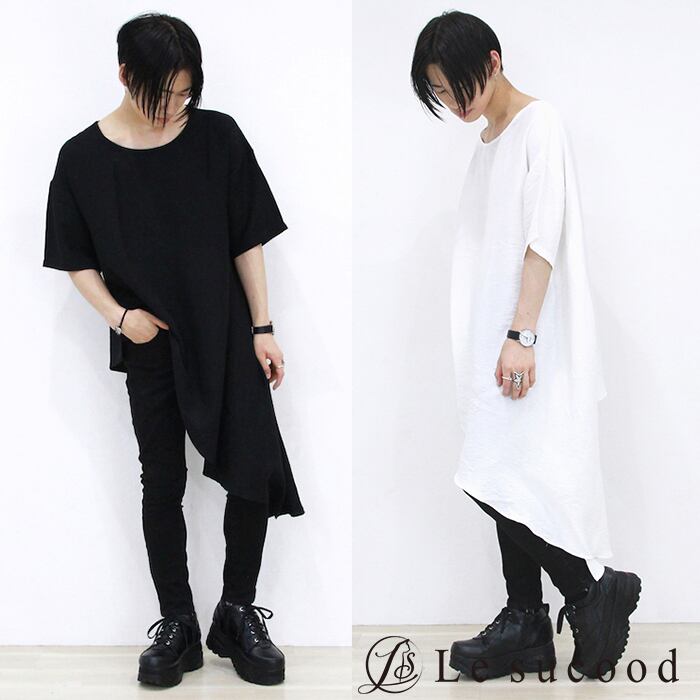 【Le sucood】【お支払い確認後20日以内発送】アシンメトリーシャツ 半袖 左右非対称 ロングシャツ ロング丈 モード系 変形シャツ モノクロ モノトーン 黒 白 Tシャツ カットソー メンズ レディース フリーサイズ Uネック アシメ