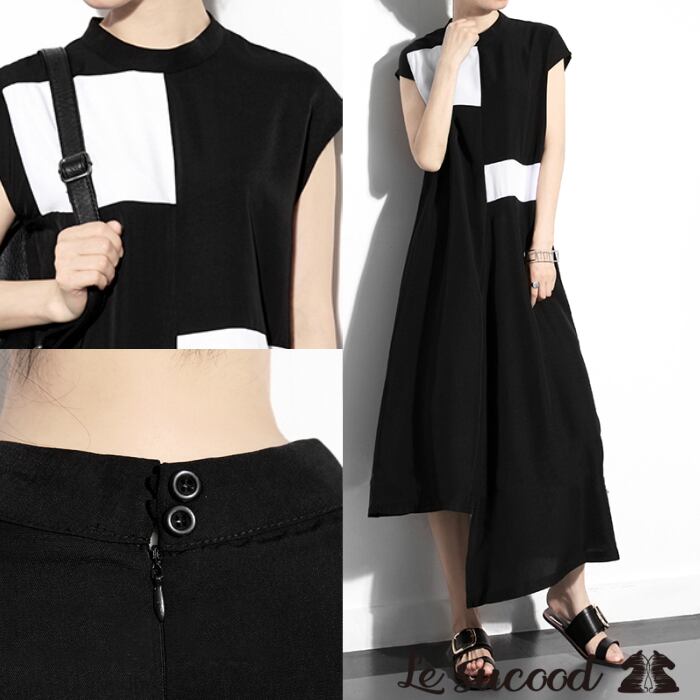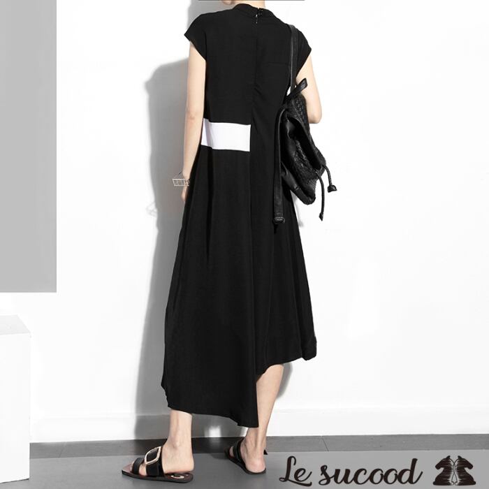 【Le sucood】 【お支払い確認後20日以内発送】top155 ノースリーブ ワンピース ロング チュニック ブラウス シャツワンピ マキシ丈ワンピース ロング丈 シャツワンピース 半袖 ツートーン モノクロ 夏服 モノトーン モード 大きいサイズ レディース フリーサイズ