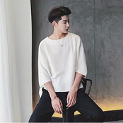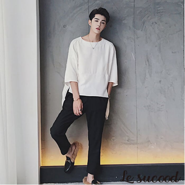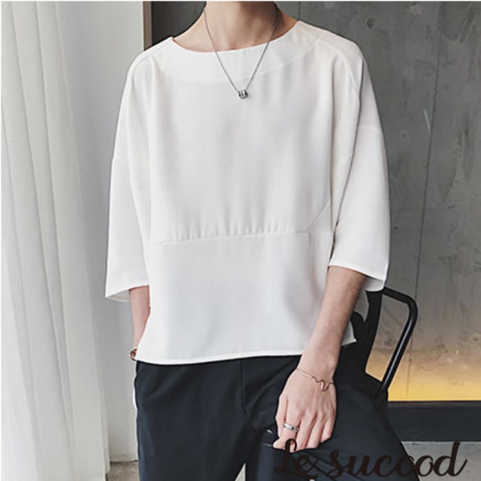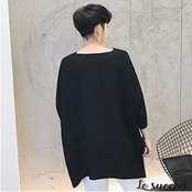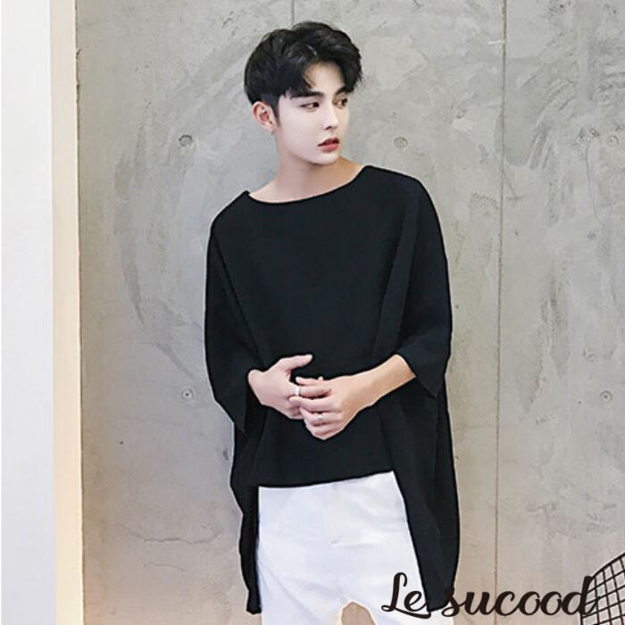 【Le sucood】スクエアヘム ビッグカットソー ボートネック Uネック メンズ ユニセックス 半袖 七分丈 春服 夏服 ゆるTシャツ 黒 白 モード系 無地 変形 ビッグシルエット 大きいサイズ シンプル ルーズTシャツ 韓国 原宿 ゆったり スリット