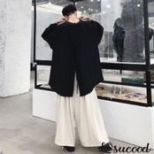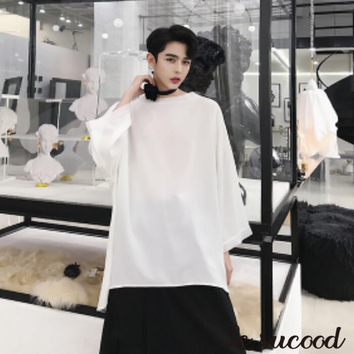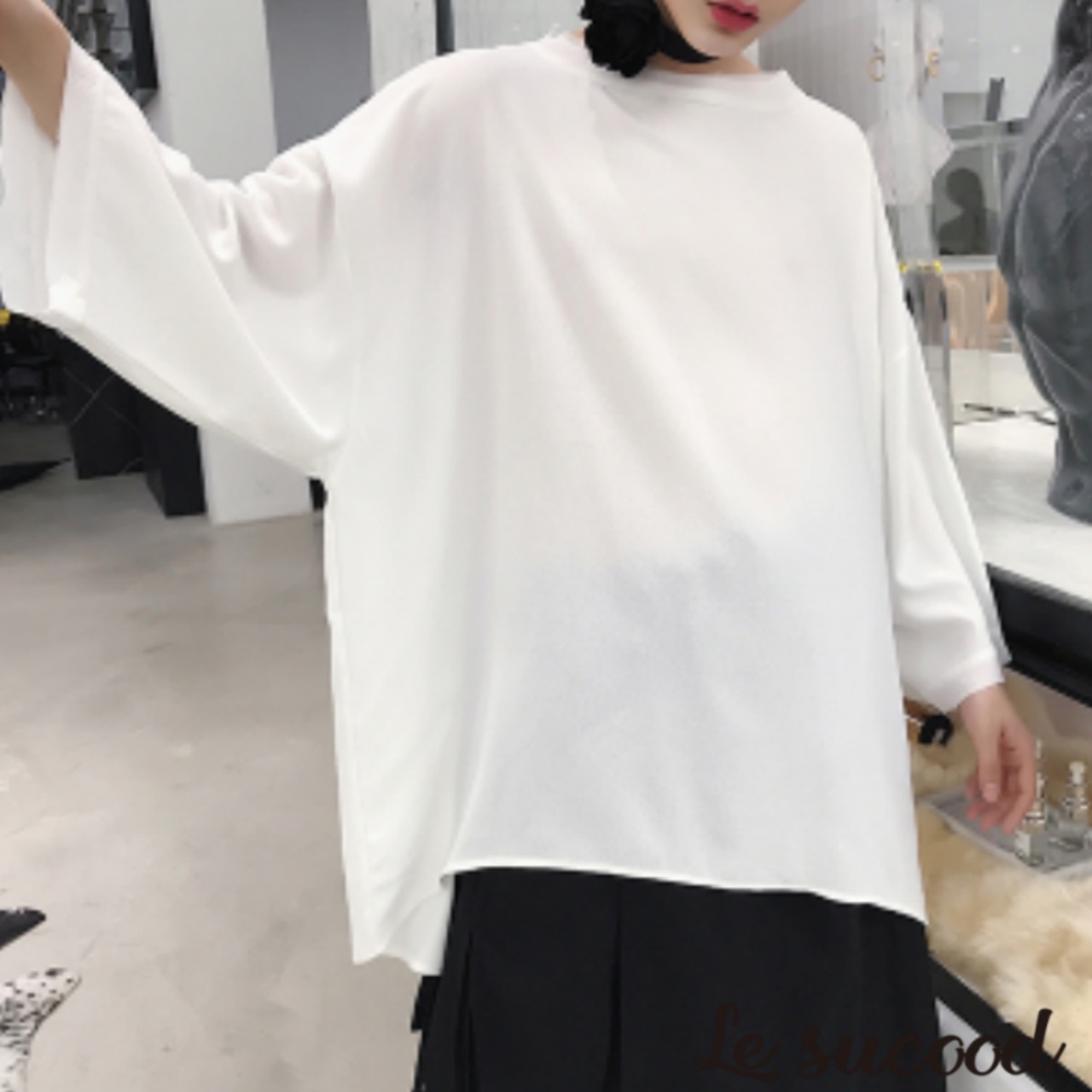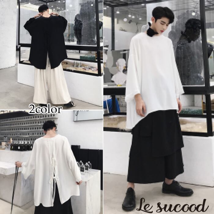 【Le sucood】【お支払い確認後20日以内発送】top0062 バックリボンデザイン コクーン カットソー 黒 白 長袖 ロングTシャツ ロンT トップス バタフライ スリット ゆったり Uネック 丸首 レース 透け感 アシメ ビッグシルエット メンズ レディース 韓国 原宿系 モード系 大きいサイズ