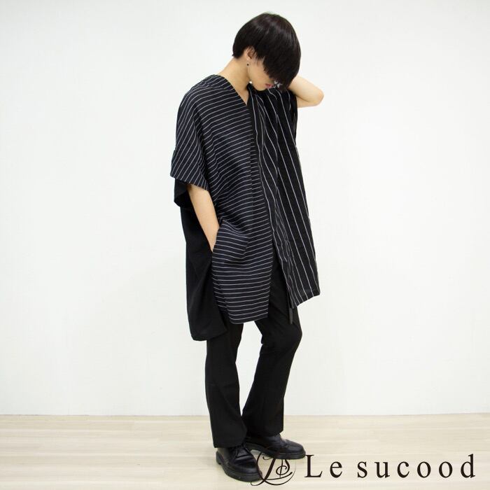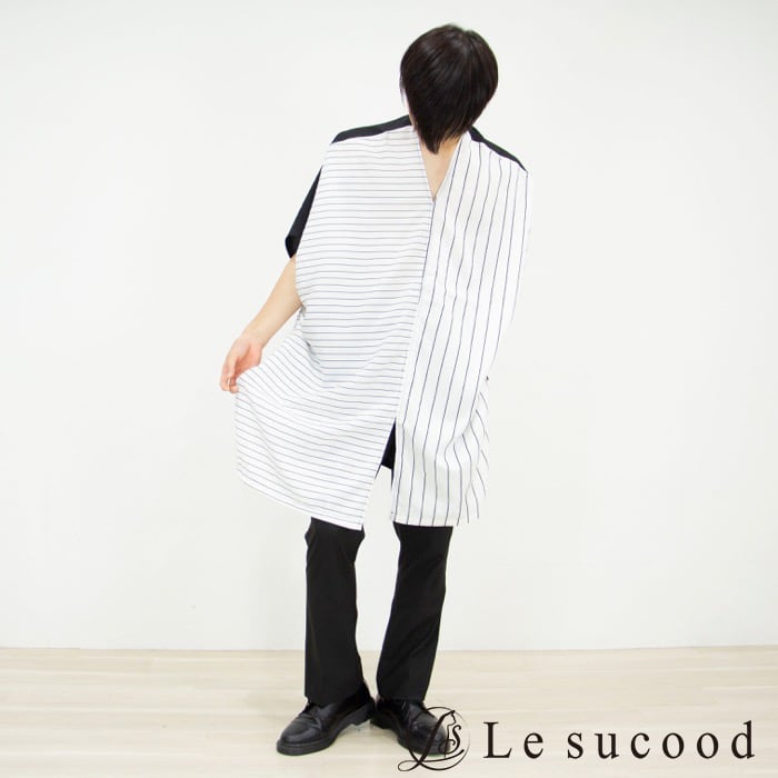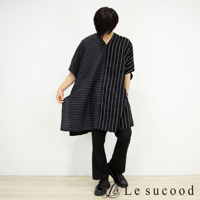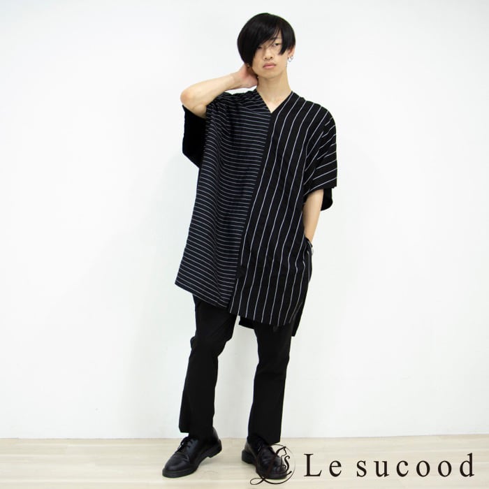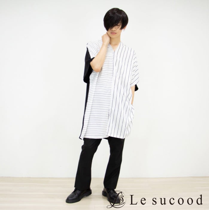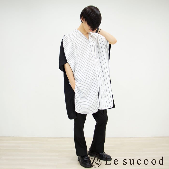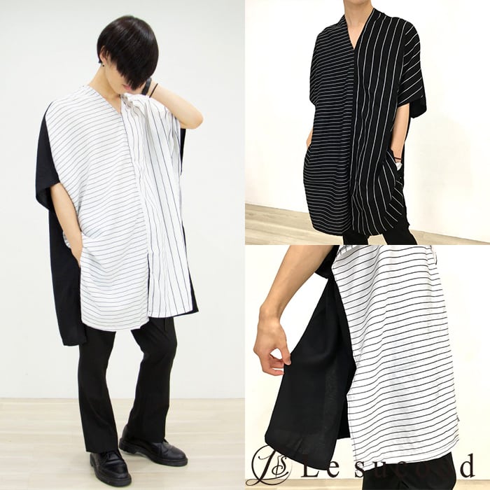 【Le sucood】【お支払い確認後20日以内発送】パッチワーク ミックスデザイン ドルマンカットソー ストライプ柄 ボーダー柄 スリット 半袖 五分袖 七分袖 メンズ レディース バイカラー 黒 白 モード系 韓国 原宿系 ビッグシルエット ゆったり トップス Tシャツ アシメ
