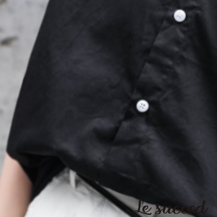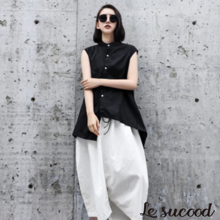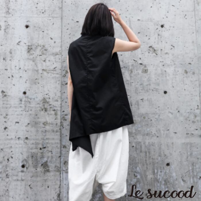 【Le sucood】【お支払い確認後20日以内発送】top068 ギミックデザイン アシメ ノースリーブシャツ 黒 変形シャツ トップス ドレープ フレア ひらひら ゆったり モード系 韓国 原宿系 ゴシック シャツ ノーカラー 切り替え 清涼感 ロングシャツ 大人可愛い アシンメトリー