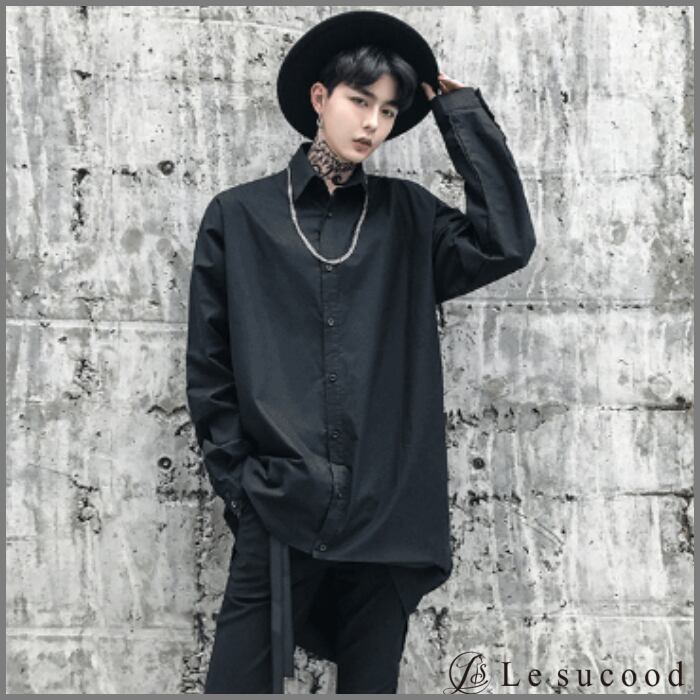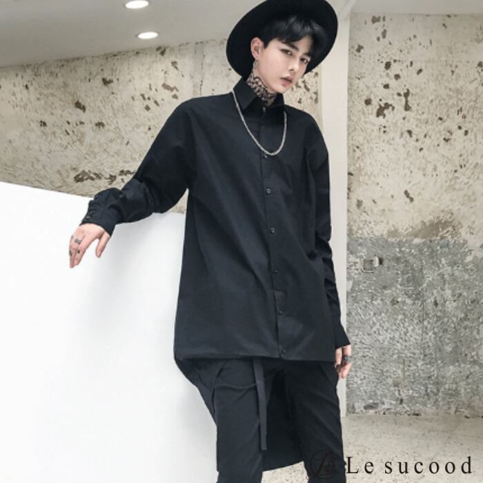 【Le sucood】【お支払い確認後20日以内発送】top086 裾変形 スクエアヘム ロングシャツ 黒 メンズ レディース 変形シャツ 長袖 秋服 冬服 ロング丈 スリム シンプル 無地 きれいめ キレカジ 韓国 V系 オシャレ 個性的 コクーン ファッション ユニセックス