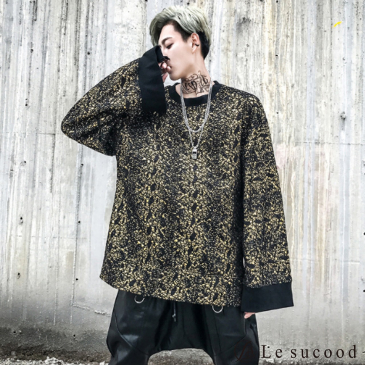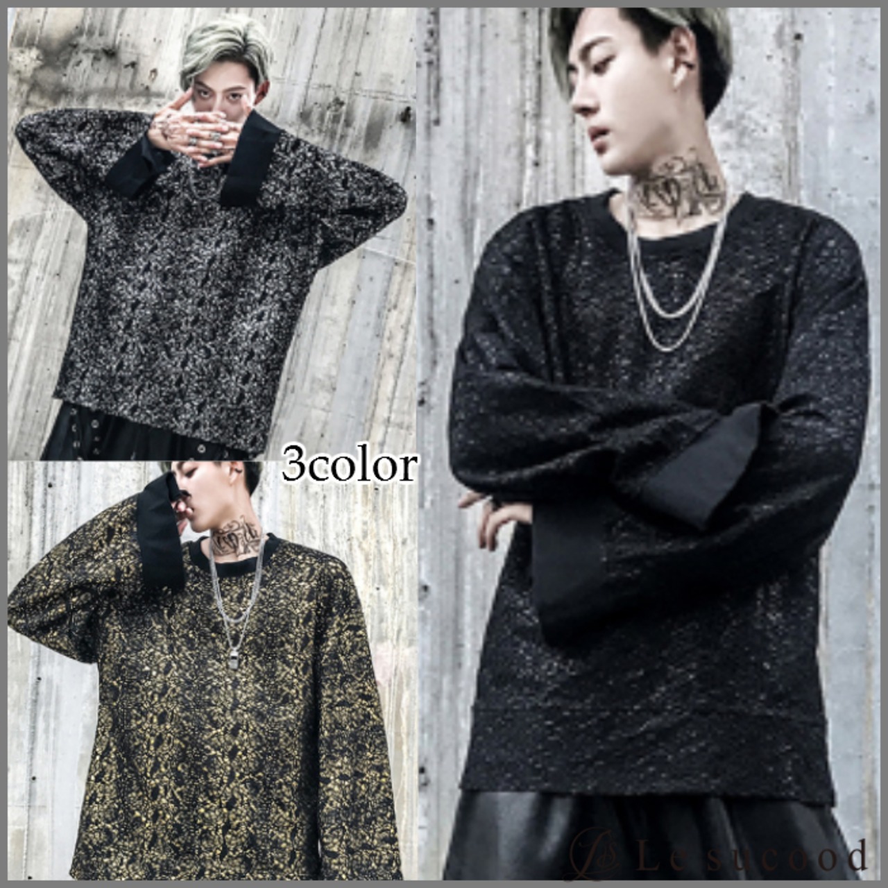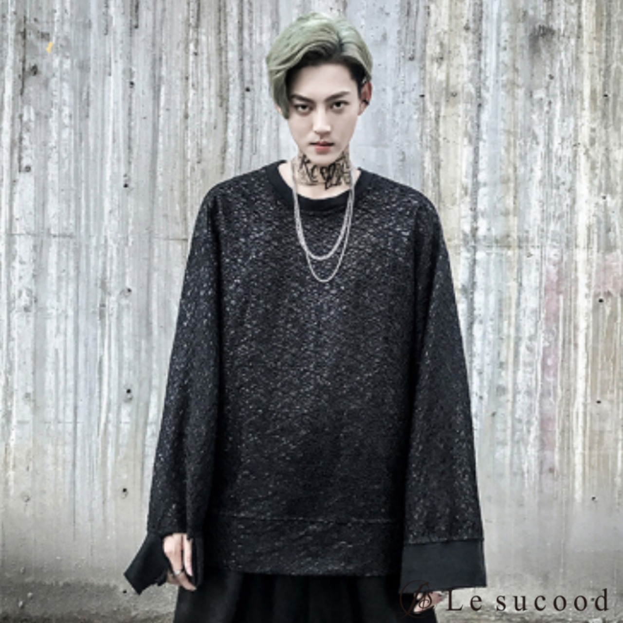 【Le sucood】【お支払い確認後20日以内発送】top087 カットオフ ルーズシルエット トレーナー ブラック ゴールド シルバー メッシュ モード系 V系 お兄系 韓国 ビッグシルエット オーバーサイズ ニット セーター メンズ トレーナー ゆったり ダメージ