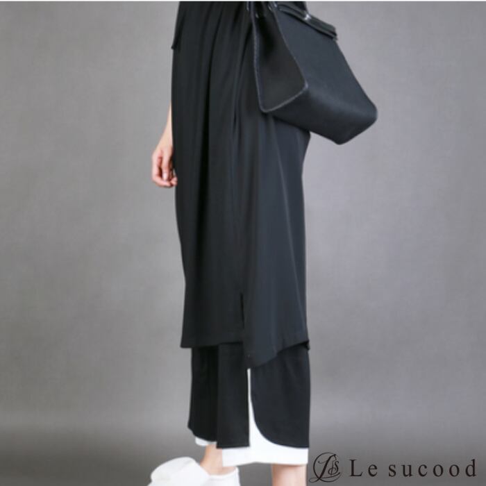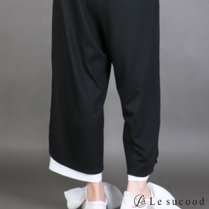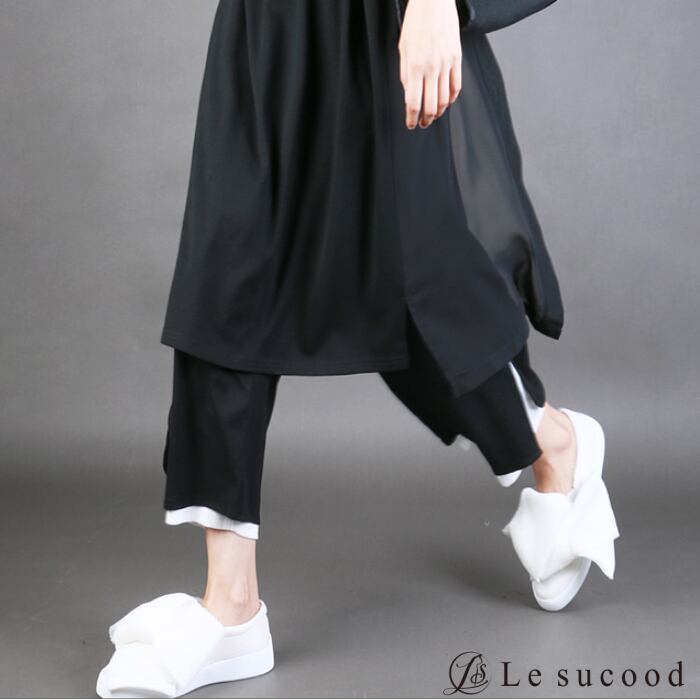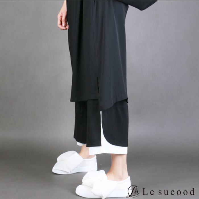 【Le sucood】【お支払い確認後20日以内発送】サイドスリット入り レイヤードパンツ ワイドパンツ ガウチョ 黒 白 スリット シンプル レディース ジャージ スウェット モード系 韓国 原宿系 ゴシック ユニセックス 大人可愛い オシャレ サルエル