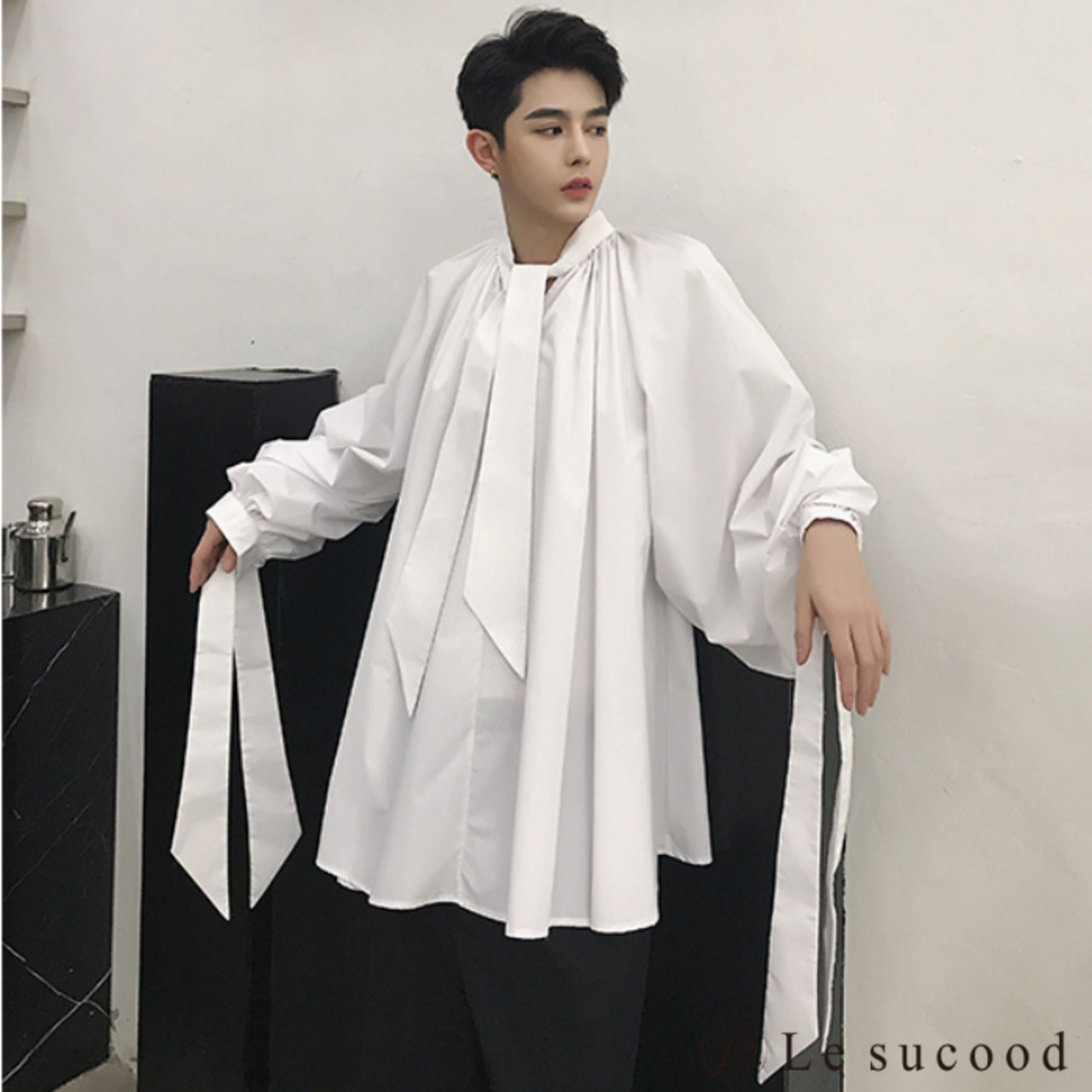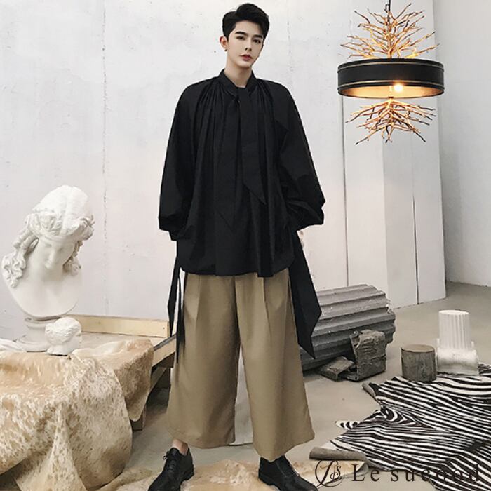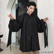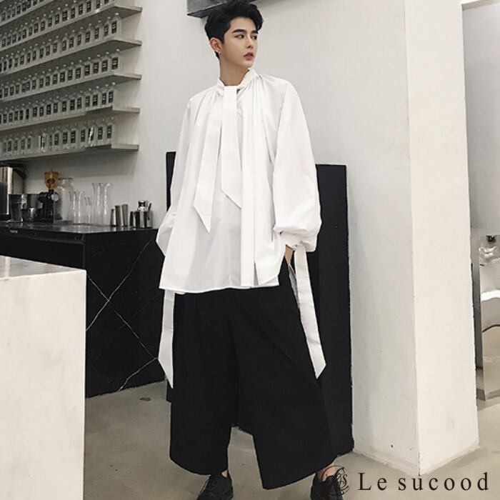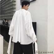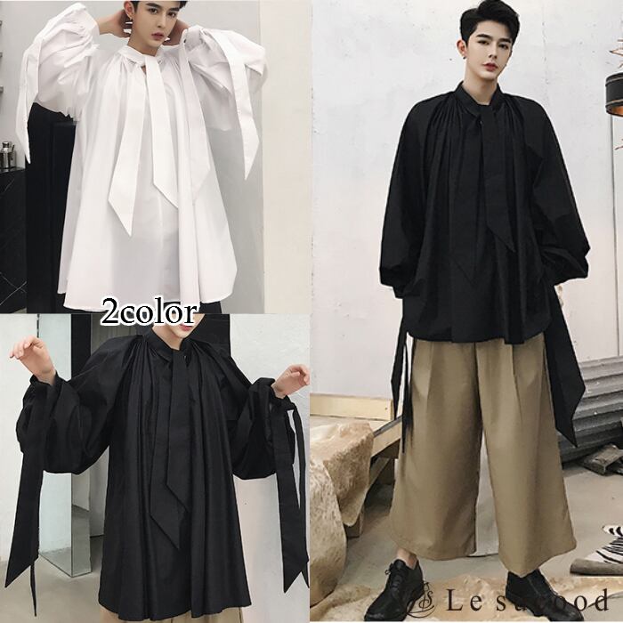 【Le sucood】【お支払い確認後20日以内発送】 リボンコード付き バルーンシルエットシャツ メンズ レディース 黒 白 ボリュームシャツ 変形シャツ リボンタイ ビッグシルエット ゆったり オーバーサイズ モード系 韓国 バルーン ワイド ロングシャツ ノーカラー