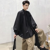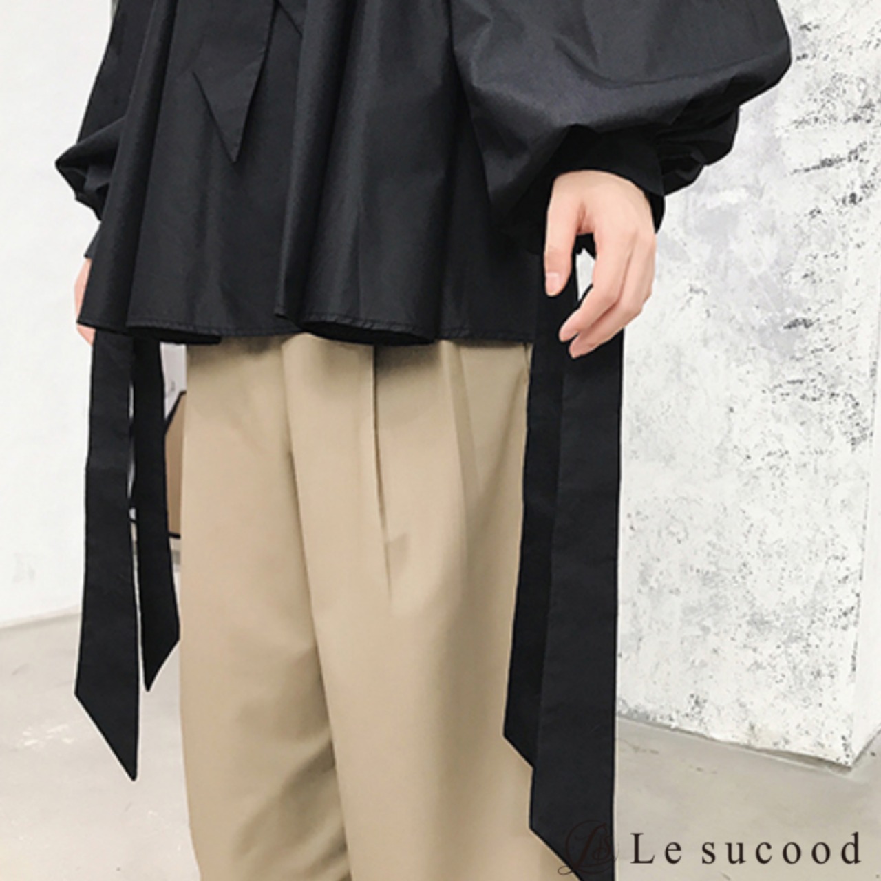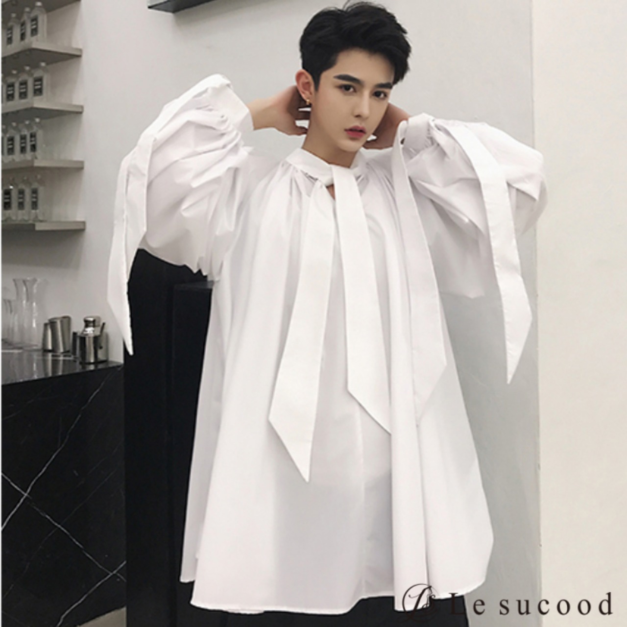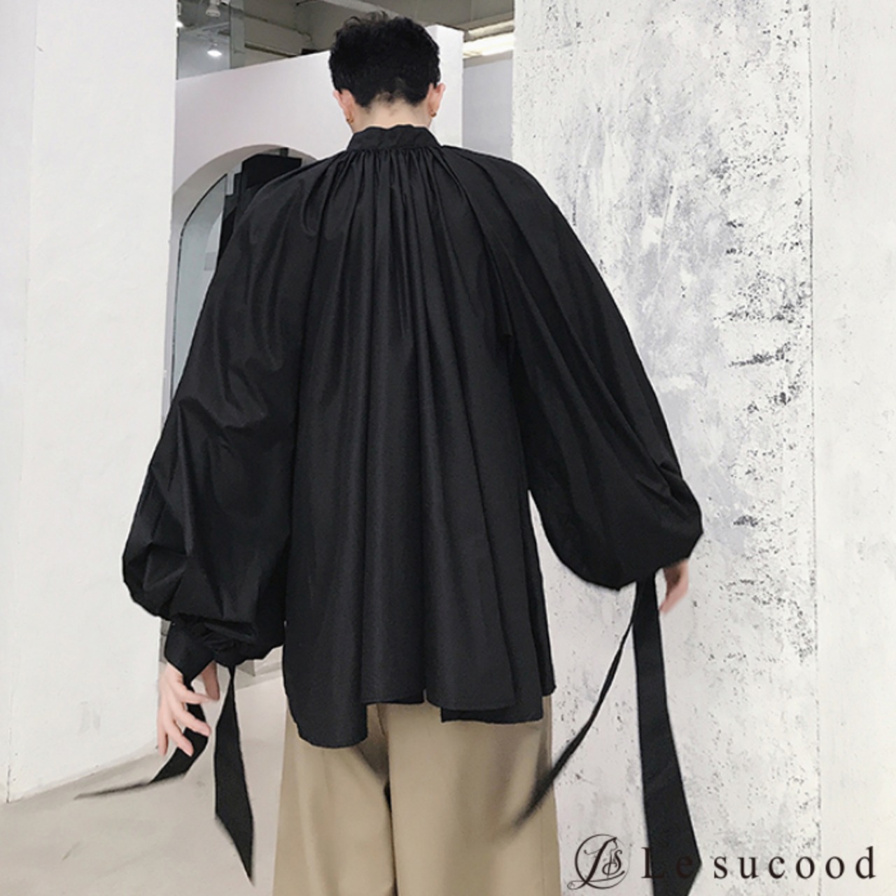 【Le sucood】【お支払い確認後20日以内発送】 リボンコード付き バルーンシルエットシャツ メンズ レディース 黒 白 ボリュームシャツ 変形シャツ リボンタイ ビッグシルエット ゆったり オーバーサイズ モード系 韓国 バルーン ワイド ロングシャツ ノーカラー