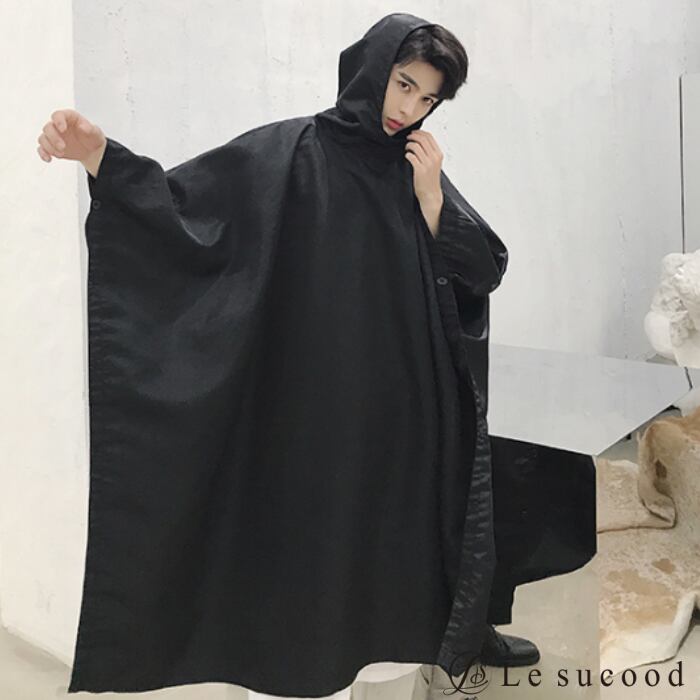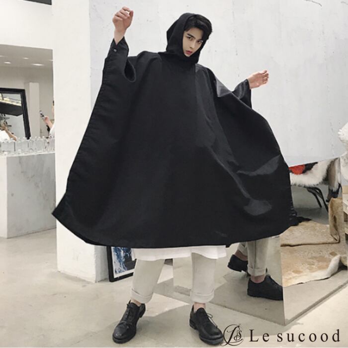 【Le sucood】【お支払い確認後20日以内発送】top097 ケープ風 アレンジデザイン ポンチョパーカー 黒 ビッグシルエット オーバーサイズ 大きいサイズ マント ゆったり メンズ レディース モード系 個性的 ドルマン ドレープ サイドスリット ロングパーカー 変形 カッパ
