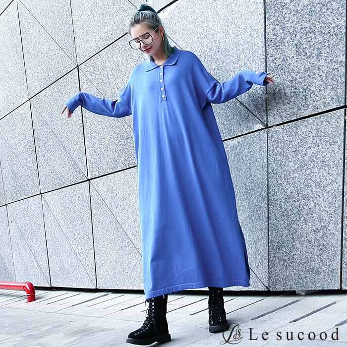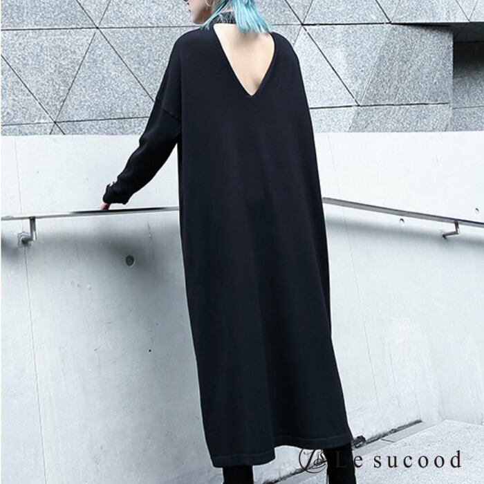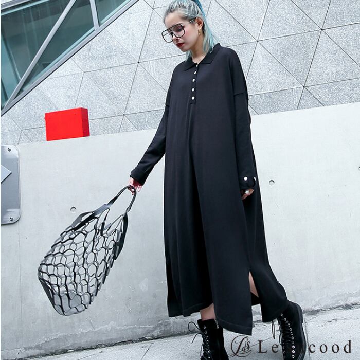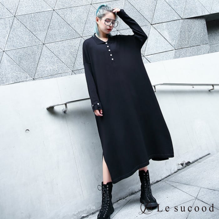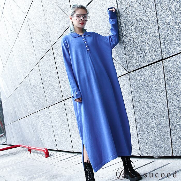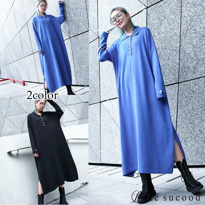 【Le sucood】【お支払い確認後20日以内発送】top115 サイドスリット ロングワンピース ニットソー レディース 黒 青 モード系 ロングワンピ マキシ丈 韓国 原宿系 ゆったり シャツワンピ ニットワンピ カジュアル オーバーサイズ 大人 きれいめ ゴシック 可愛い