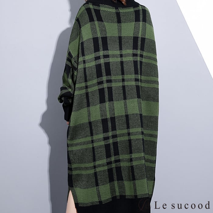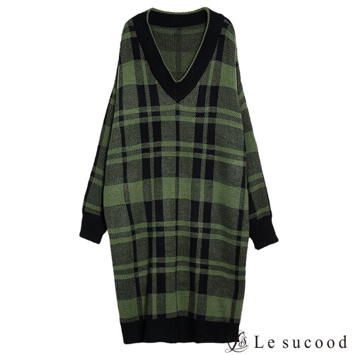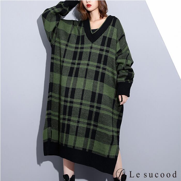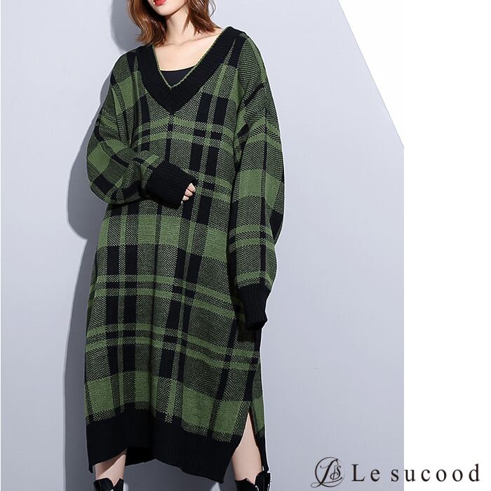 【Le sucood】【お支払い確認後20日以内発送】top116 タータンチェック ワンピース スリットニットソー レディース チェック柄 ニットワンピ セーター 黒 赤 緑 ツートン モード系 カジュアル ロングワンピ ロング丈 マキシ丈 秋服 冬服 アウター 大きいサイズ ゆったり