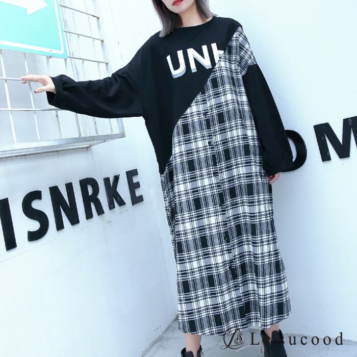【Le sucood】【お支払い確認後20日以内発送】top118 バイカラー サイドスリット ドルマンワンピース レディース チェック柄 黒 白 モード系 ストリート オーバーサイズ ゆったり ロングワンピース ロングワンピ シャツワンピ 韓国 原宿系 ゴシック マキシ丈 トレーナー アシメ
