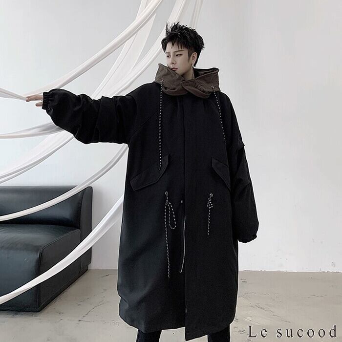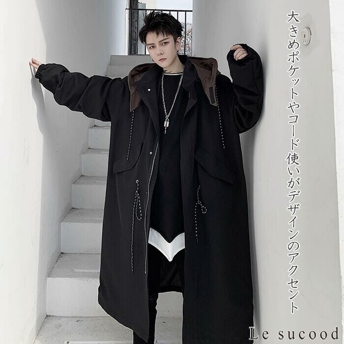 【お支払い確認後20日以内発送】Le sucood フード付き ロングコート メンズ 切り替え ジャケット ミドル丈 モード系 オーバーサイズコート オーバーサイズコート ビッグシルエットコート ゆったり デザインコート ボリュームシルエット ストリート系 サロン系 個性的 原宿系 ファッション