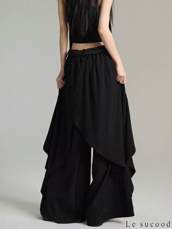 【お支払い確認後20日以内発送】Le sucood 黒無地 スカートパンツ レディース モード系 キュロット レイヤードパンツ ワイドパンツ ワイドレッグパンツ ワイドレッグスカートパンツ ドレープパンツ デザインパンツ モノトーン モード系 ストリート系 サロン系 個性的 原宿系 ファッション