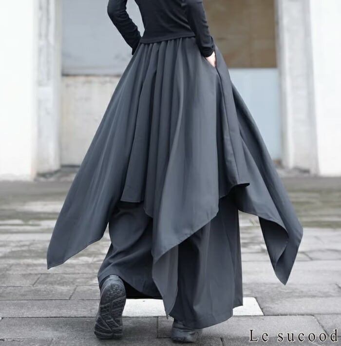 【お支払い確認後20日以内発送】Le sucood 黒無地 スカートパンツ レディース モード系 キュロット レイヤードパンツ ワイドパンツ ワイドレッグパンツ ワイドレッグスカートパンツ ドレープパンツ デザインパンツ モノトーン モード系 ストリート系 サロン系 個性的 原宿系 ファッション