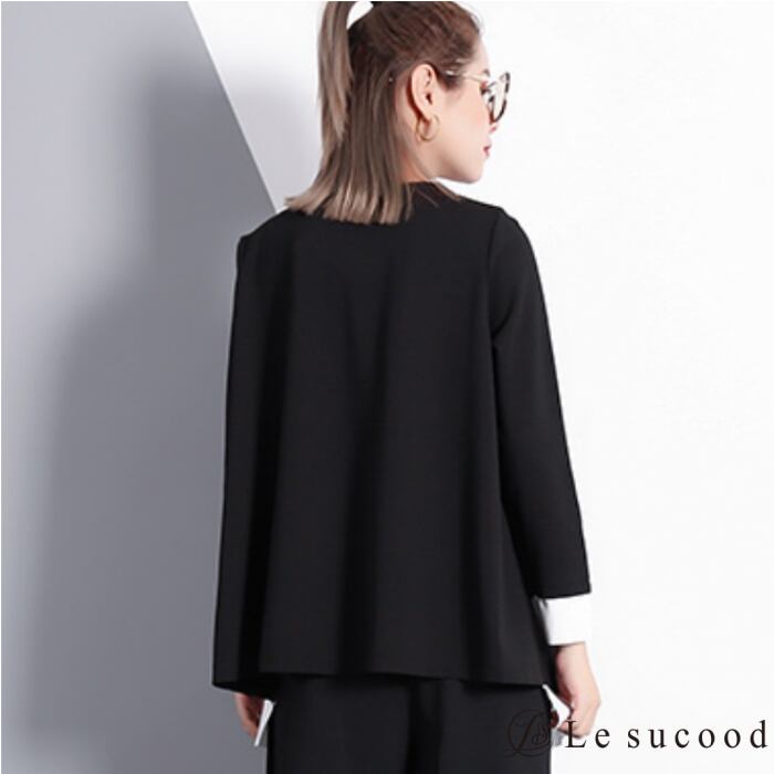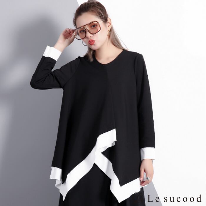 【Le sucood】【お支払い確認後20日以内発送】top119 タック入り フェイクレイヤードカットソー レディース モード系 変形Tシャツ ロンT 黒 ブラック ドレープ レイヤード トップス ストリート 韓国 長袖 バイカラー 個性的 無地 フレアシルエット シンプル かわいい