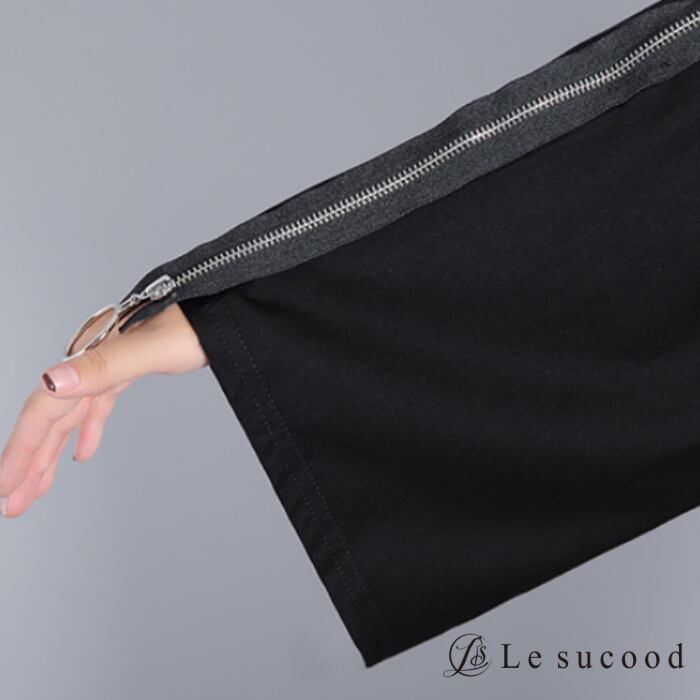 【Le sucood】【お支払い確認後20日以内発送】 ファスナー付き ロングスリーブカットソー 黒 ブラック レディース メンズ モード系 個性的 変形Tシャツ ロンT 長袖 トップス ゴシック 韓国 原宿系 ジップアップ ビッグシルエット ゆったり オーバーサイズ アシメ