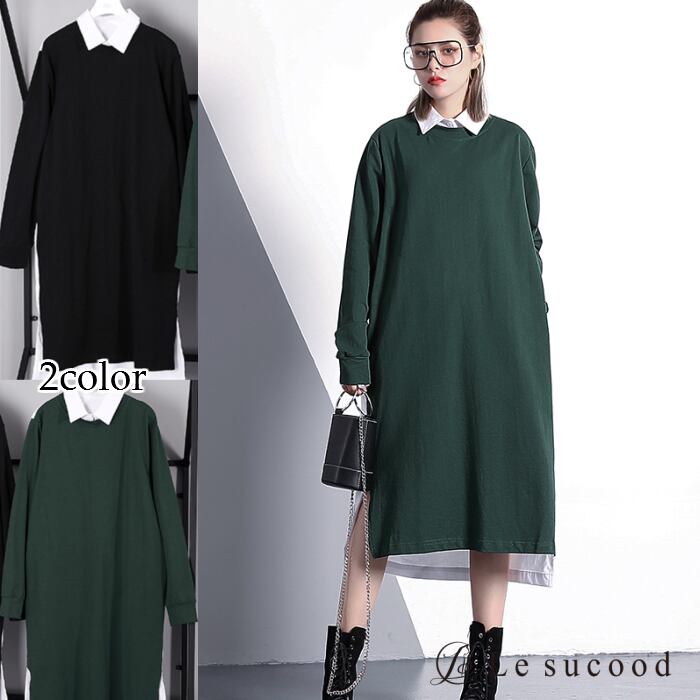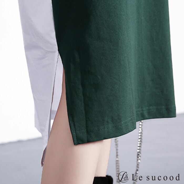 【Le sucood】【お支払い確認後20日以内発送】top122 サイドスリット ニットシャツワンピース レディース 黒 緑 モード系 カジュアル ニットワンピ シャツワンピ バイカラー ミックス オーバーサイズ かわいい ロングワンピ ワンピース きれいめ 秋服 冬服 ニット