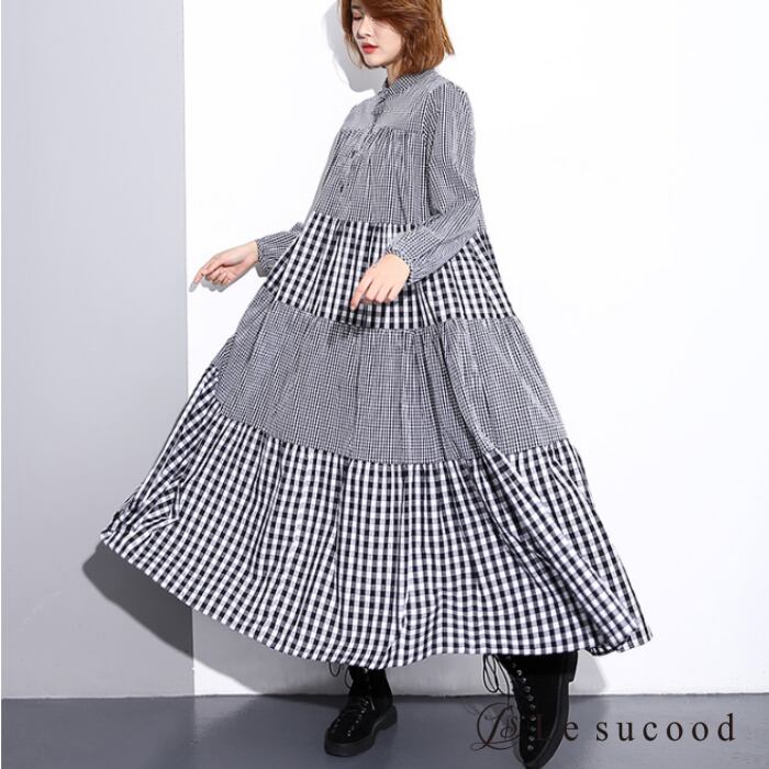 【Le sucood】【お支払い確認後20日以内発送】top125 ギンガムチェック 切り替え ロングワンピース チェック柄 グレー レディース モード系 上品 カジュアル シャツワンピ ロングワンピ マキシ丈 フレアワンピ Aライン ロング丈 丸襟 ノーカラー ゴシック 大人 きれいめ
