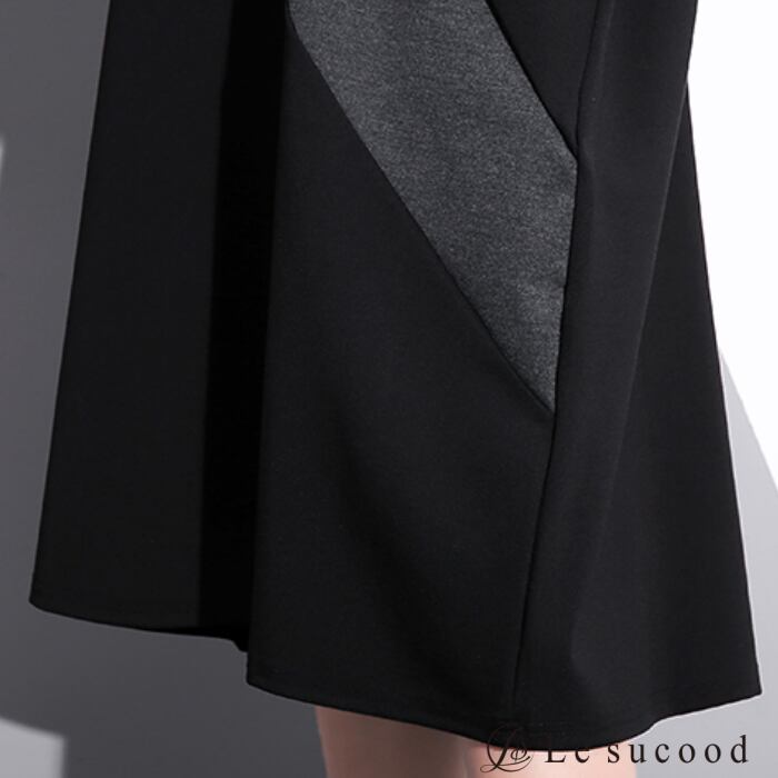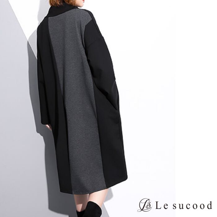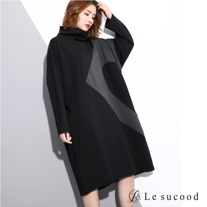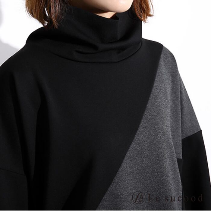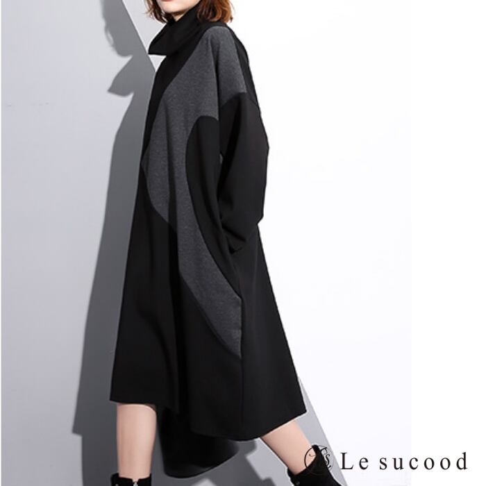 【Le sucood】【お支払い確認後20日以内発送】top126 カウルネック ルーズスリーブワンピース ブラック レディース モード系 黒ワンピ ロングワンピ トレーナー ビッグシルエット 大きいサイズ オーバーサイズ バイカラー 切り替え ハイネック ボリューム ゴシック 韓国 原宿系