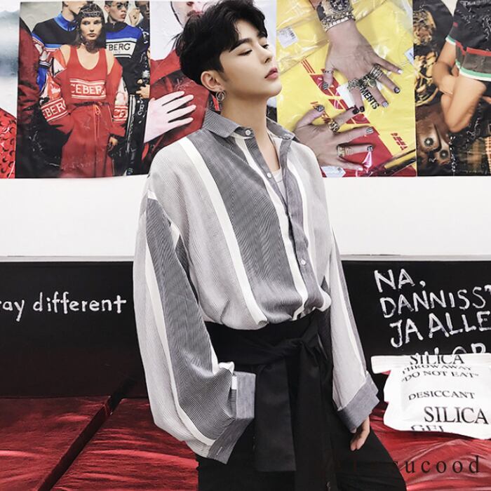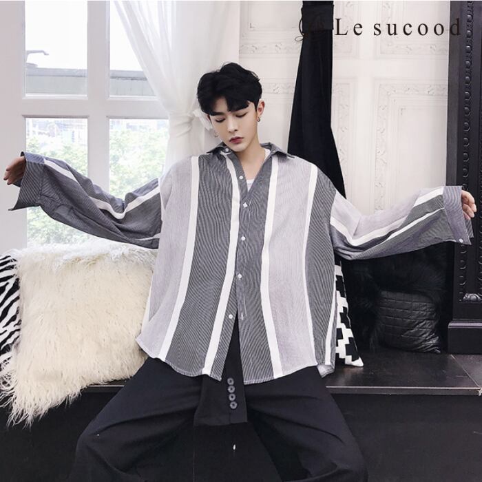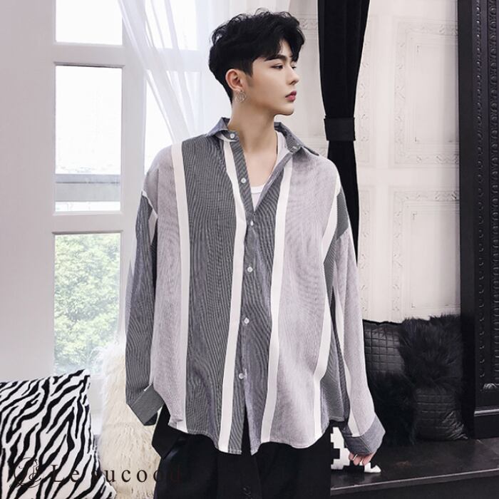 【Le sucood】【お支払い確認後20日以内発送】top131 カスケードストライプ柄 オーバーシャツ ゴシック ロング丈 ロングスリーブ モード系 メンズ ユニセックス レディース 変形ストライプ バイカラー ビッグシルエット 大きいサイズ ロングシャツ ワイド ゆるシャツ