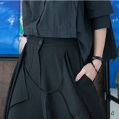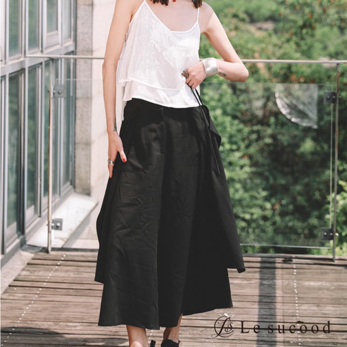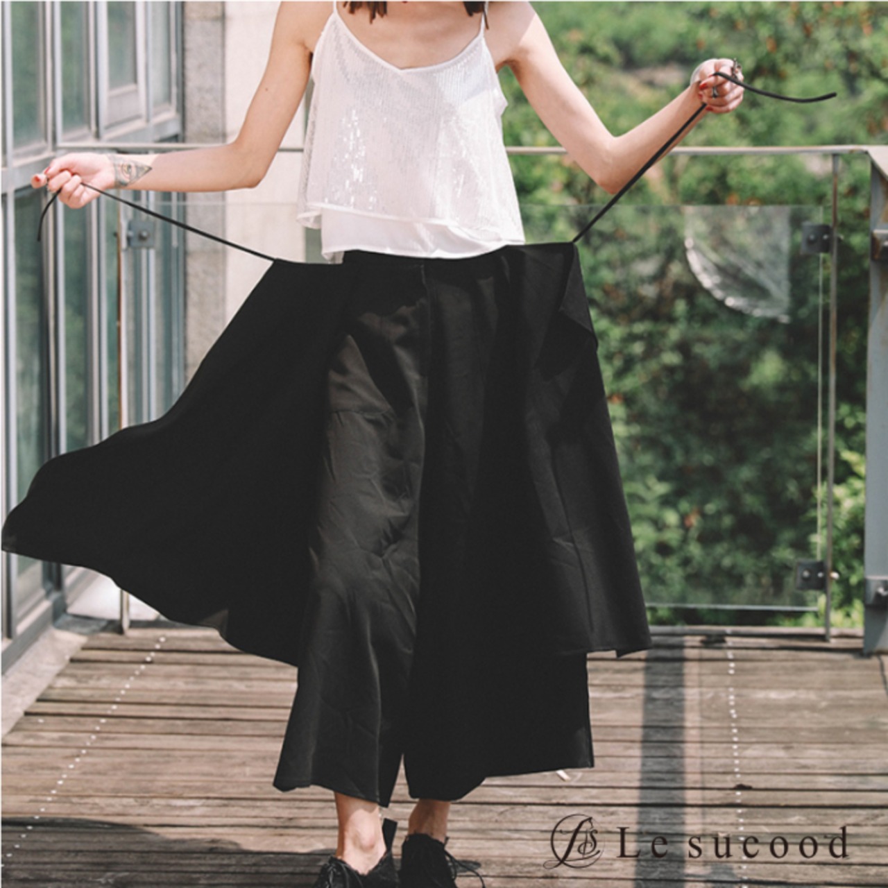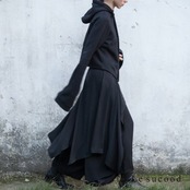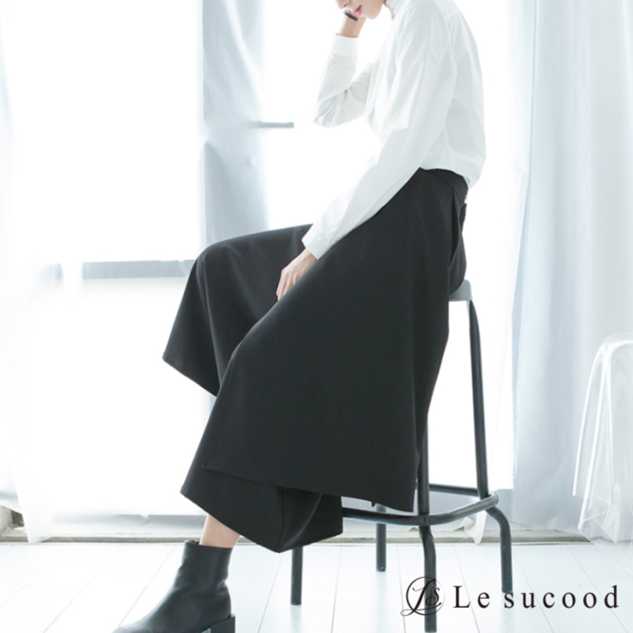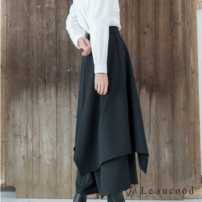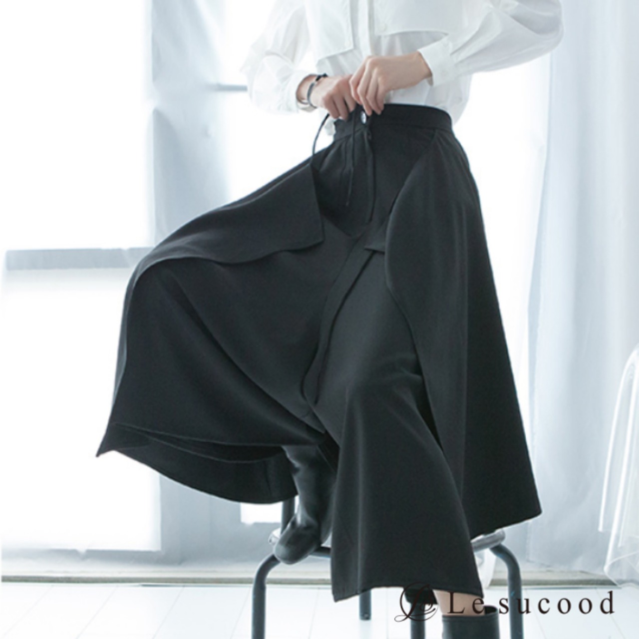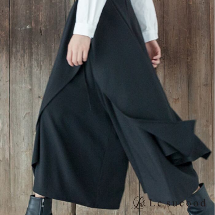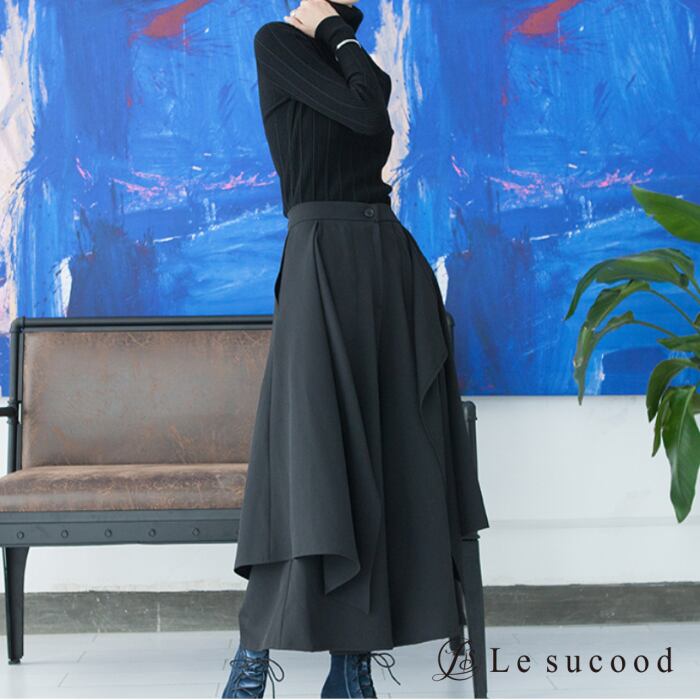【Le sucood】btm033 変形 エプロン付き 袴パンツ レディース 巻きスカート アシンメトリー モード系 ゴシック 黒 ブラック ワイドパンツ スカンツ プリーツ 個性的 ドレープ ガウチョ ゆったり オーバーサイズ アシメ はかま | Le sucood