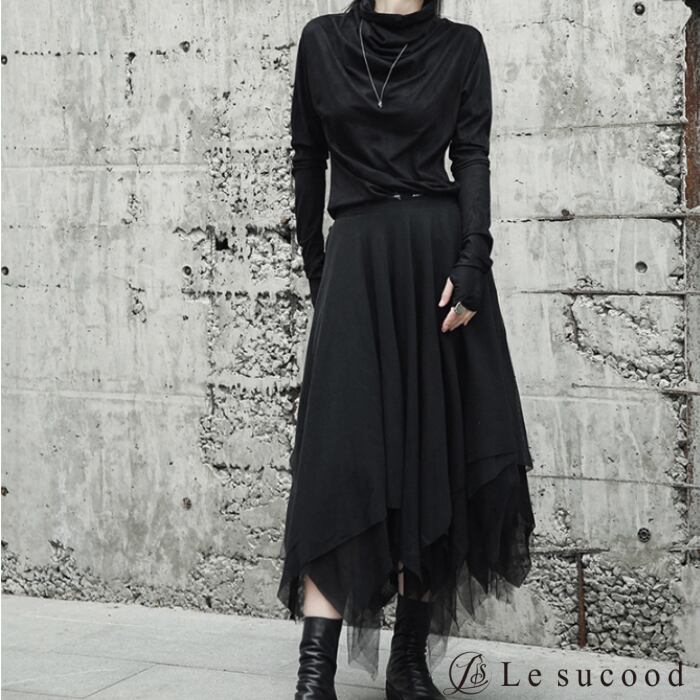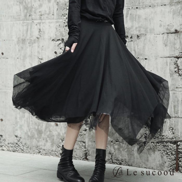 【Le sucood】【お支払い確認後20日以内発送】btm036 蜘蛛レース付き ヘムカット ロングスカート ゴシック モード系 個性的 アシンメトリー 原宿系 イレギュラー レディース メンズ 黒 ブラック レイヤード ドレープ ミモレ丈 シフォン フレア 変形