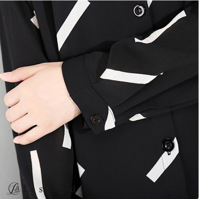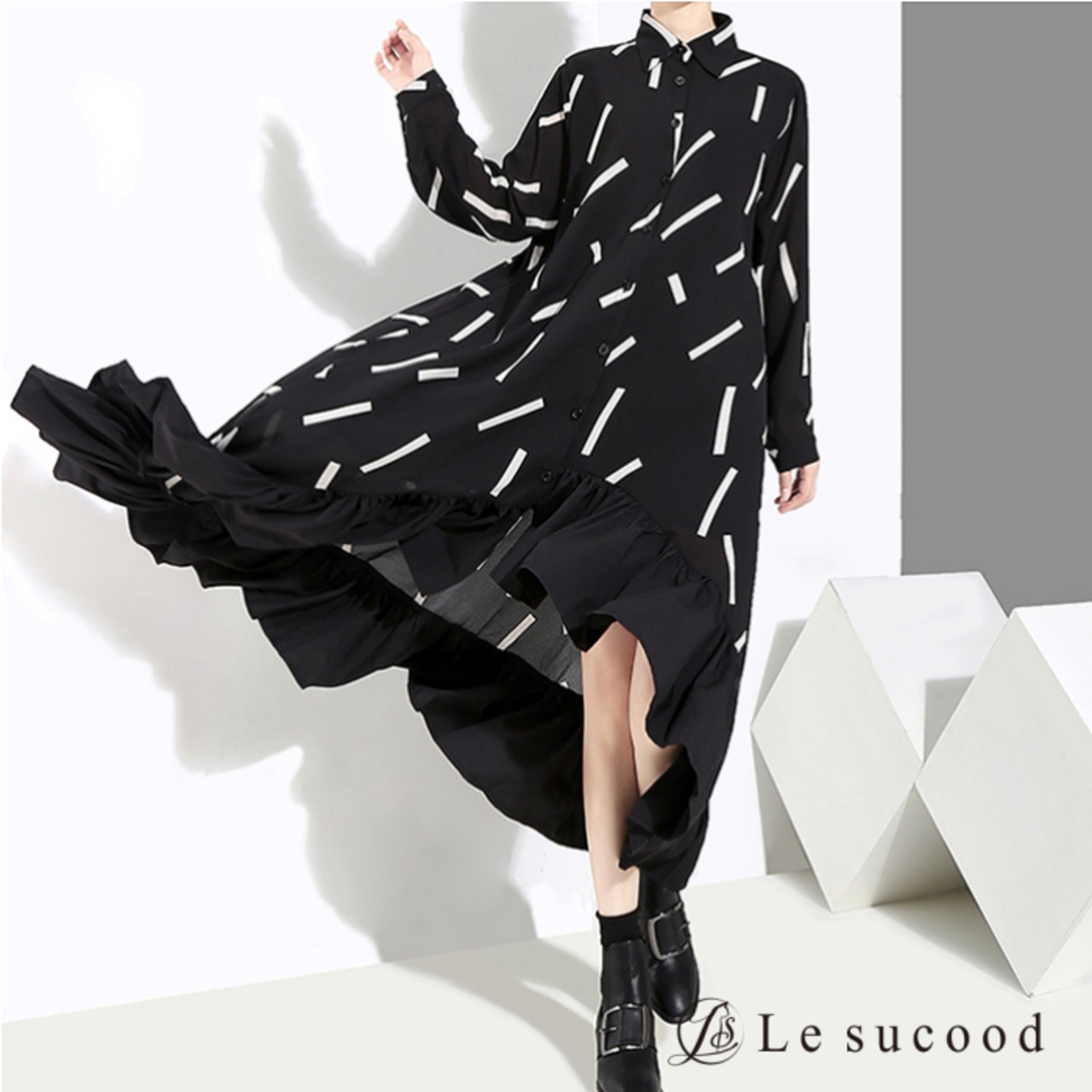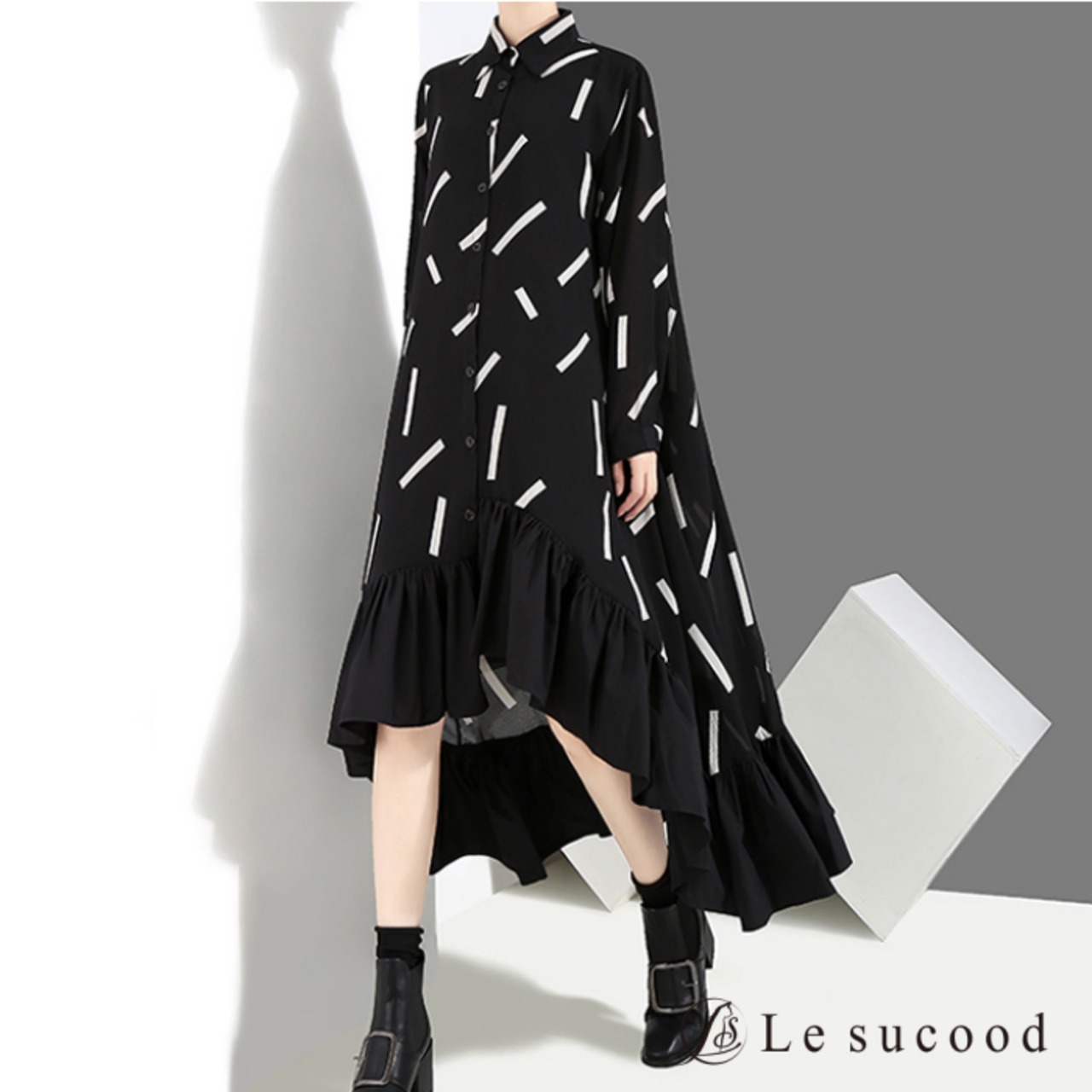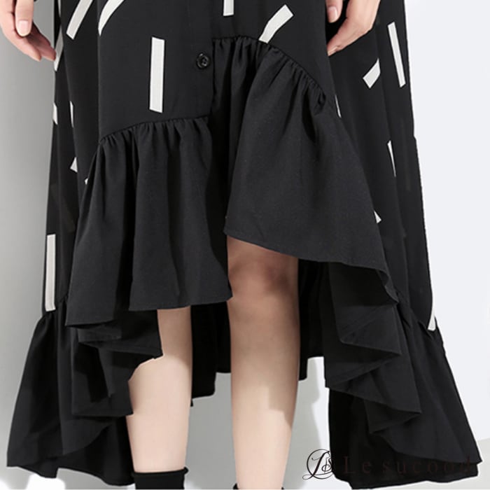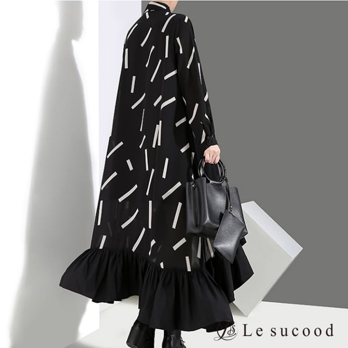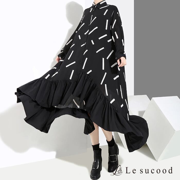 【Le sucood】【お支払い確認後20日以内発送】top146 グラフィック柄 フレア シャツワンピース モノトーン アシメ アシンメトリー シャツワンピ ロングシャツ ロングワンピ フリル ドレープ 黒 ブラック レディース モード系 韓国 原宿系 ビッグシルエット ゴシック 大人かわいい