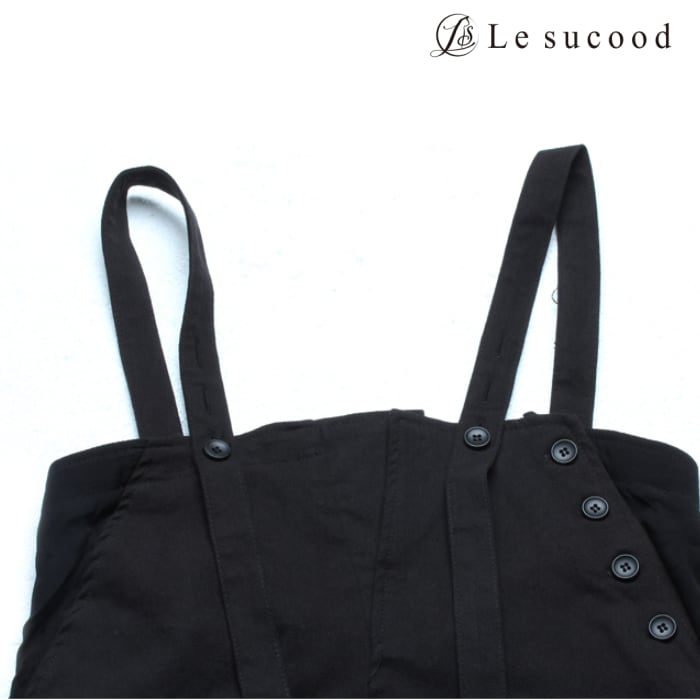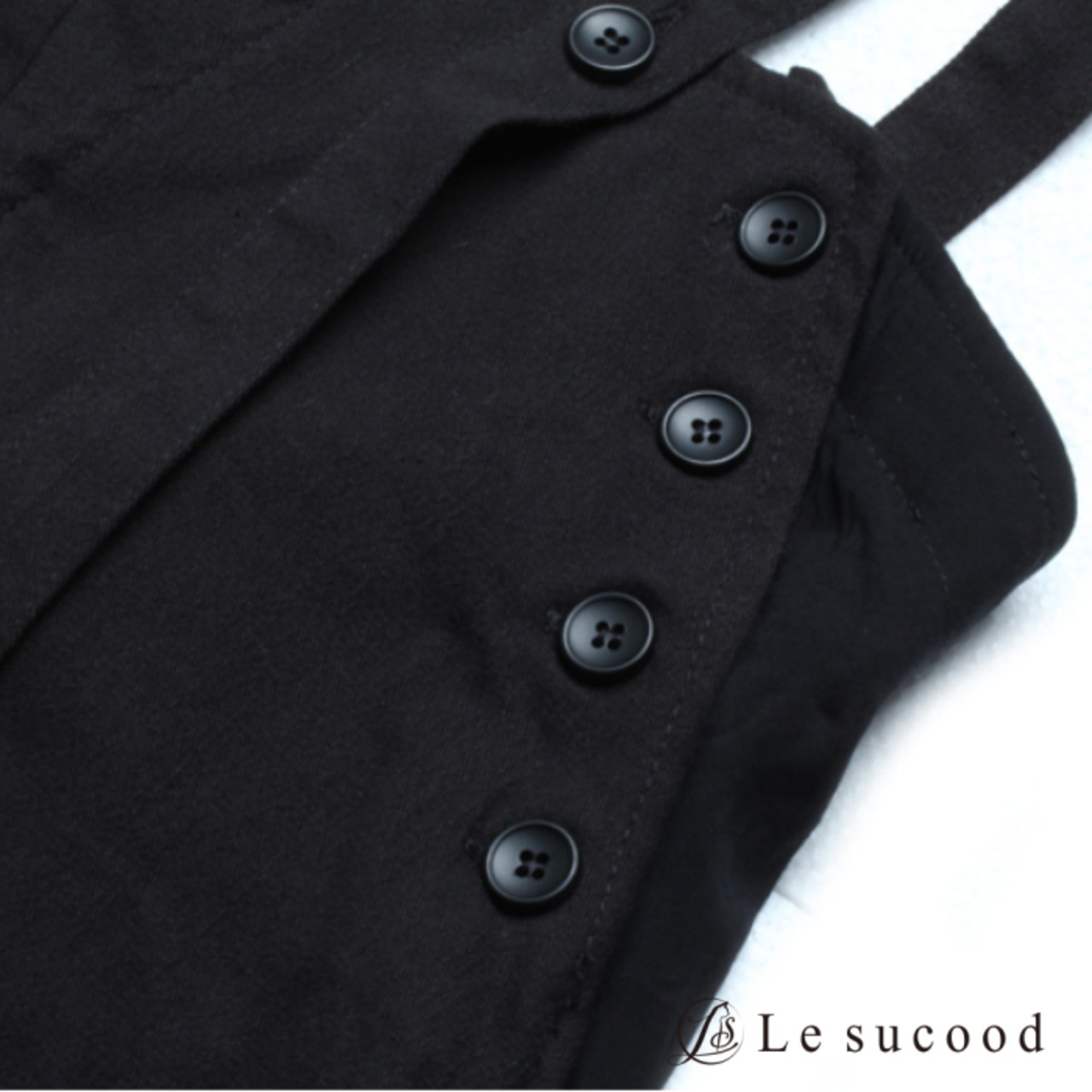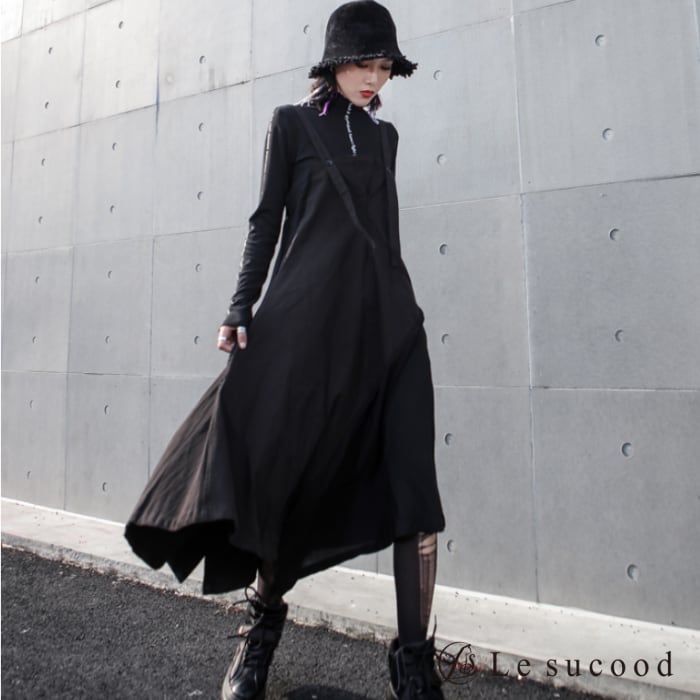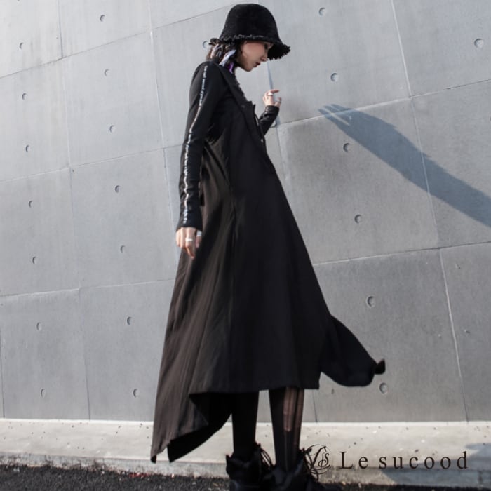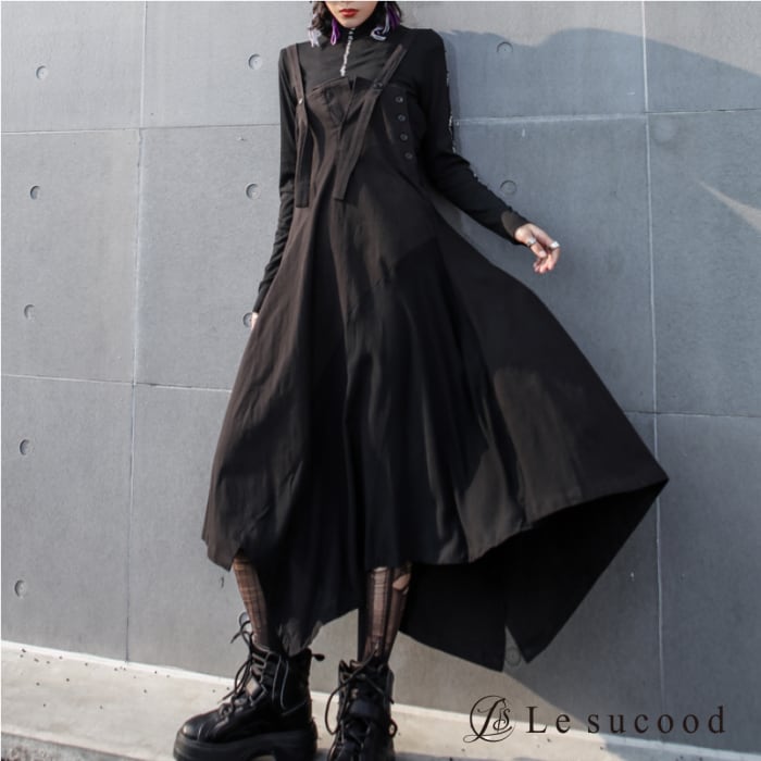 【Le sucood】top150 バイカラー アシメ ジャンパースカート タック アシンメトリー レディース 黒 ブラック モード系 ゴシック 韓国 原宿系 オーバーオール フレア Aライン ロングスカート サロペットスカート ドレープ 変形スカート