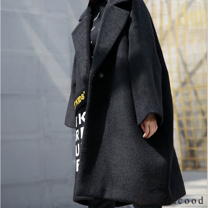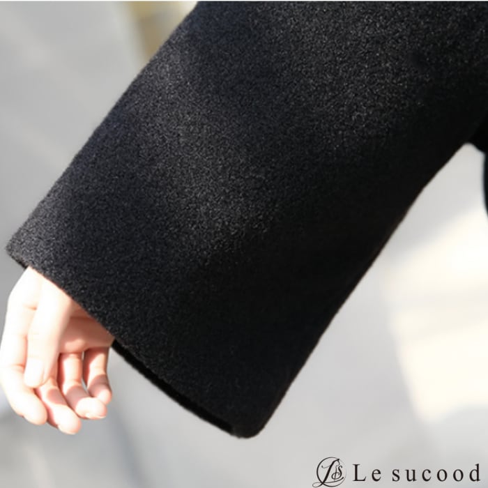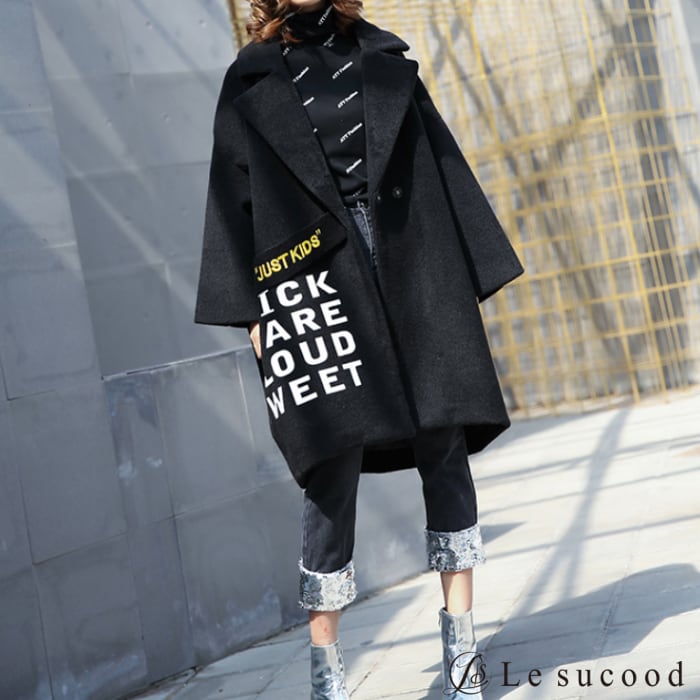 【Le sucood】【お支払い確認後20日以内発送】out052 ロゴ入り トレンチモチーフ ウールコート ガウン ロングコート Pコート レディース 黒 ブラック モード系 韓国 個性的 ビッグサイズ ビッグシルエット アウター ビジュアル系 V系 トレンチコート ジャケット