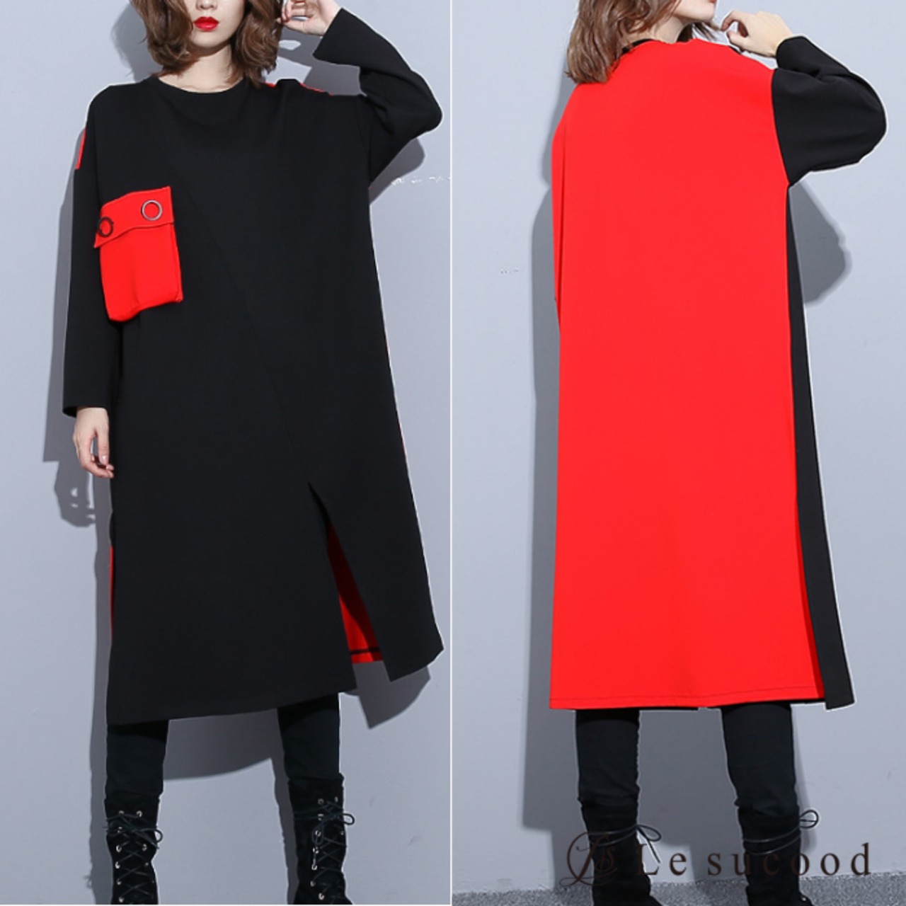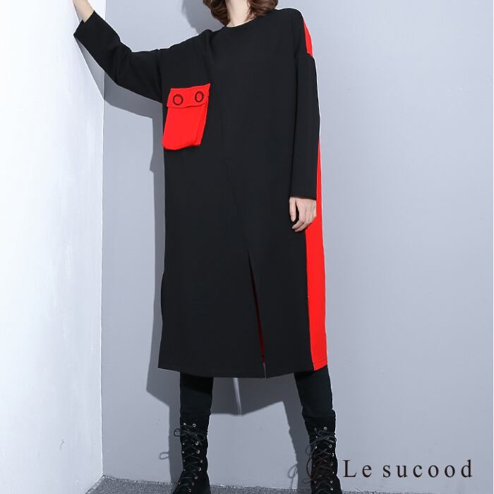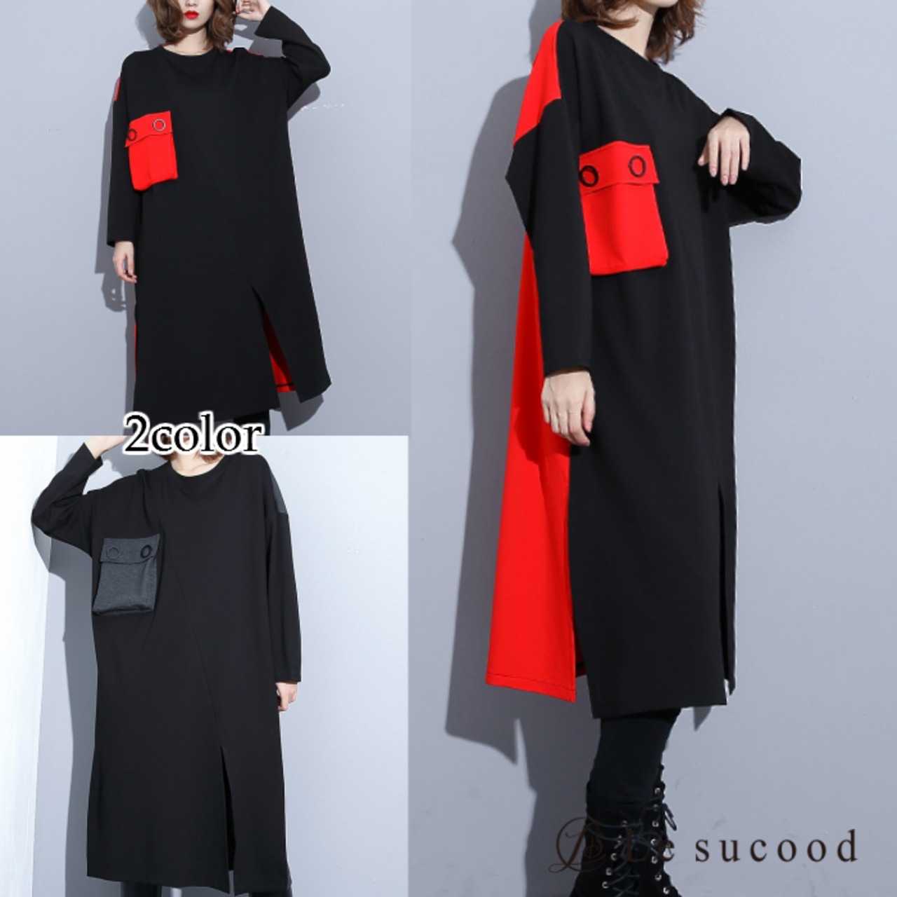 【Le sucood】【お支払い確認後20日以内発送】ディープスリット入り バイカラー ロングワンピース ビッグポケット ロングワンピ ロング丈 モード系 ゴシック 韓国 黒 ブラック 赤 レッド シャツワンピ 長袖 レディース ユニセックス ビッグシルエット 大きいサイズ