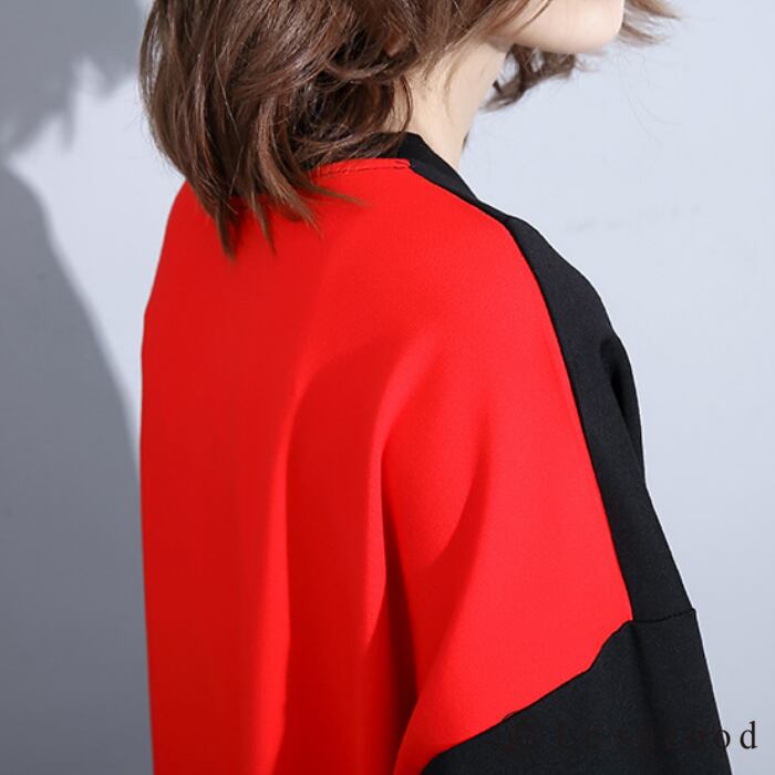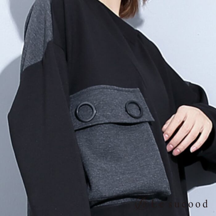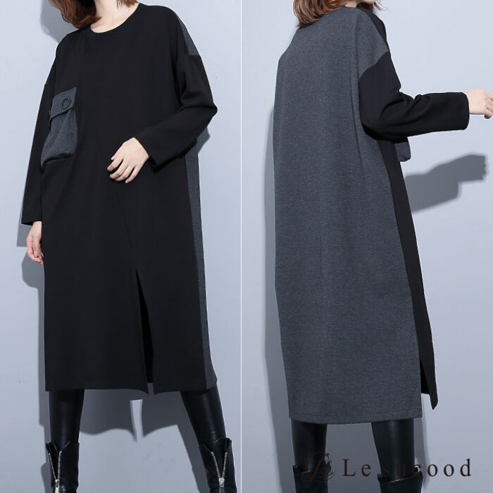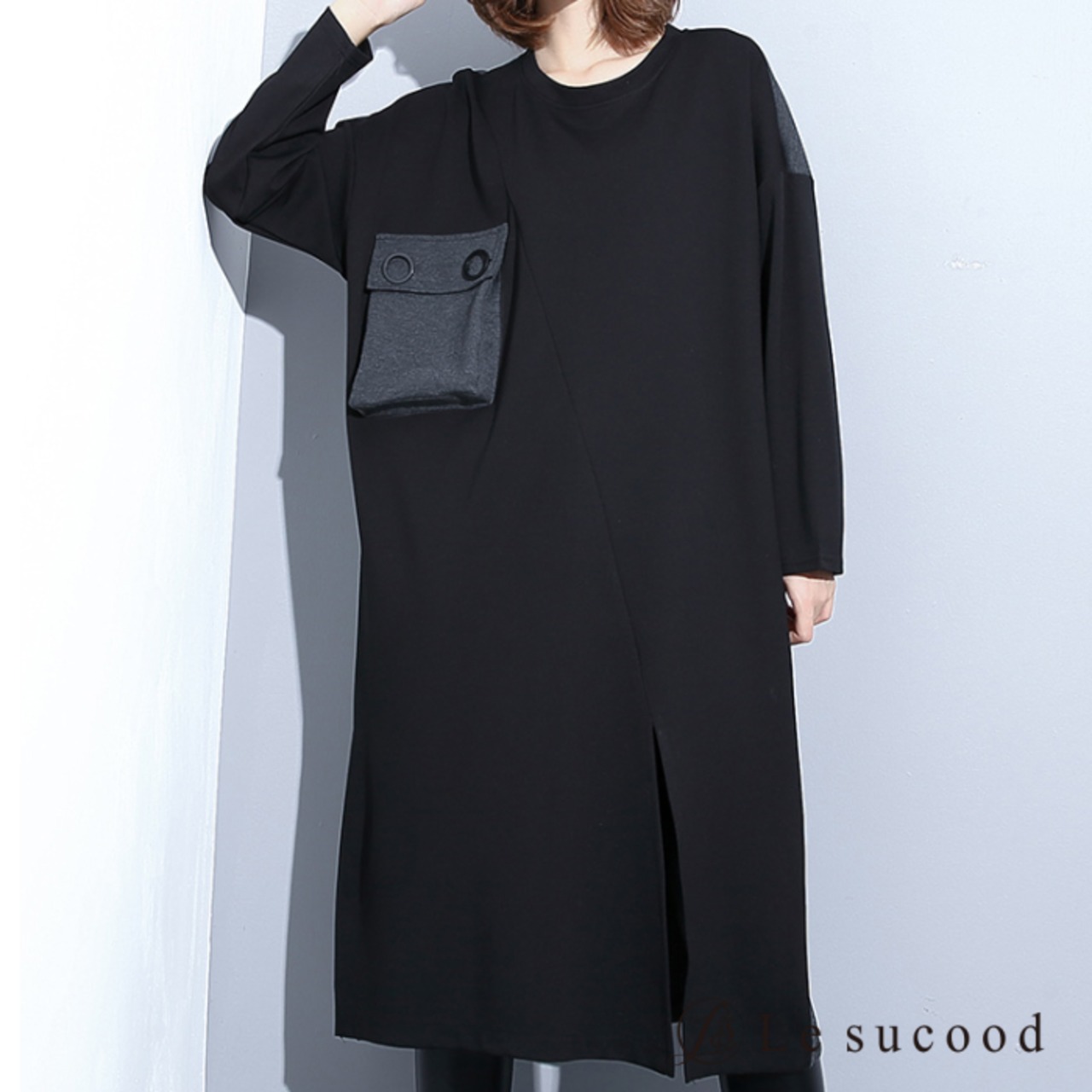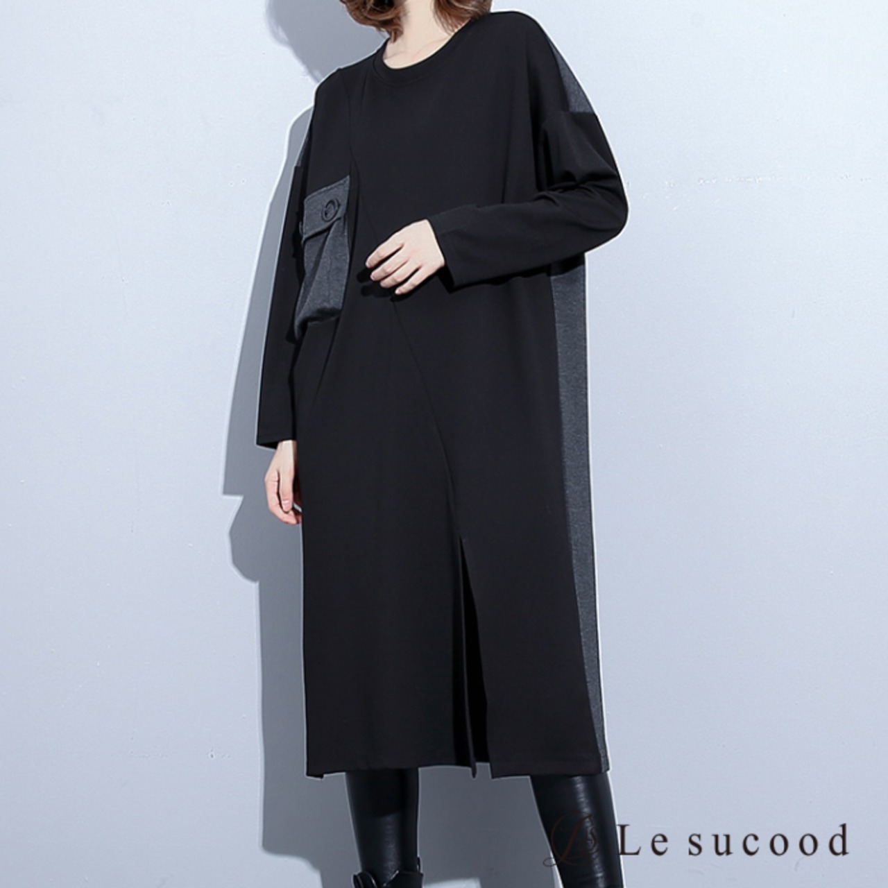 【Le sucood】【お支払い確認後20日以内発送】ディープスリット入り バイカラー ロングワンピース ビッグポケット ロングワンピ ロング丈 モード系 ゴシック 韓国 黒 ブラック 赤 レッド シャツワンピ 長袖 レディース ユニセックス ビッグシルエット 大きいサイズ