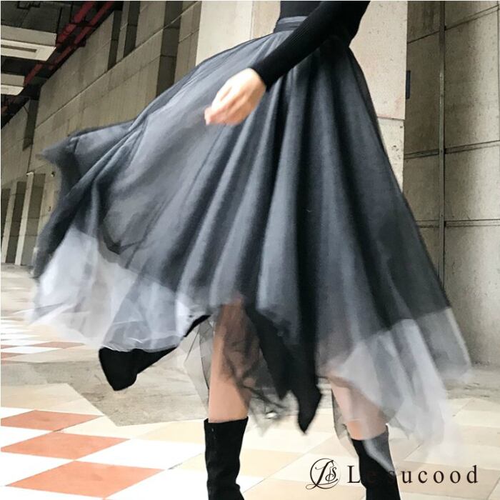 【Le sucood】【お支払い確認後20日以内発送】btm074 重ねメッシュ フェイクレイヤード ロングスカート グレー ミックス MIX チュールスカート アシンメトリー アシメ オーガンジー イレギュラーヘム 巻きスカート フラップ モード系 ゴシック 韓国系 大人かわいい 上品 レディース