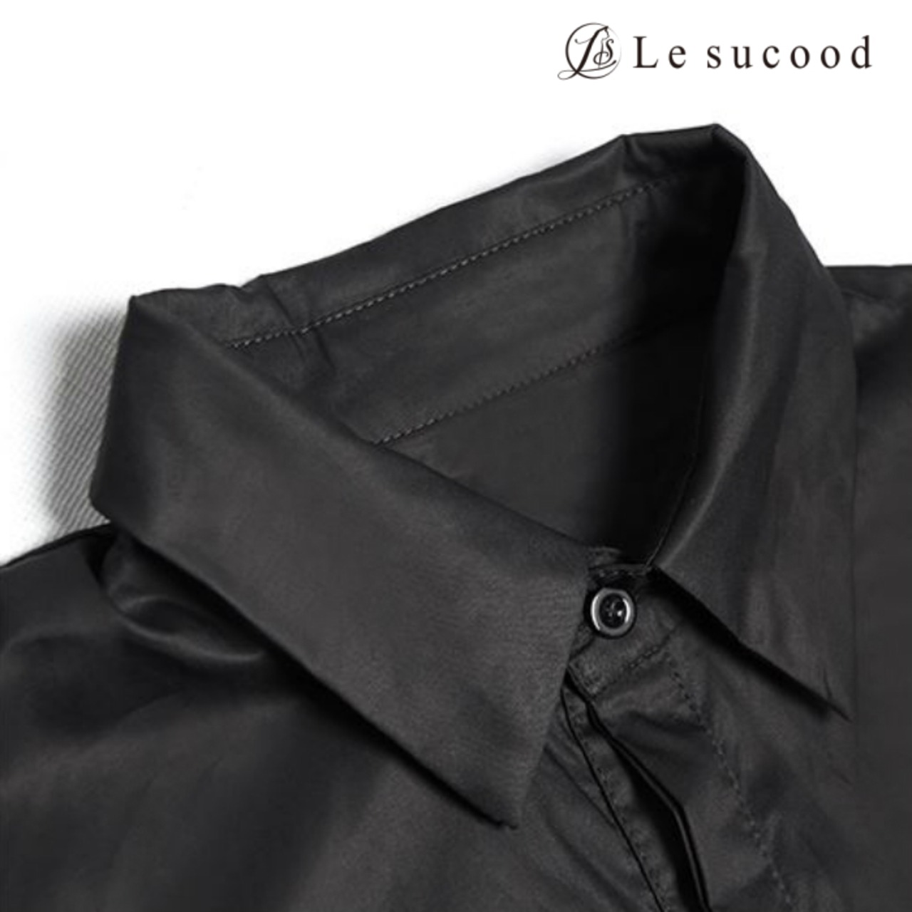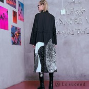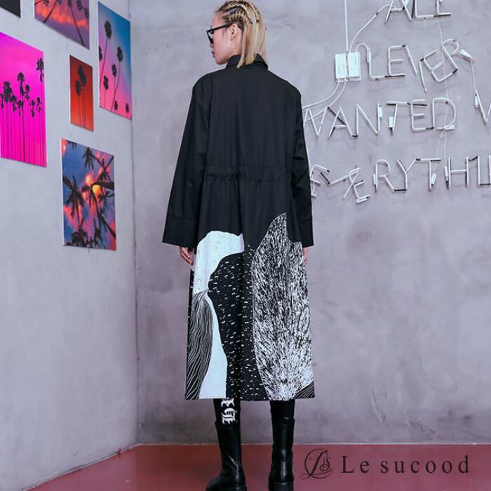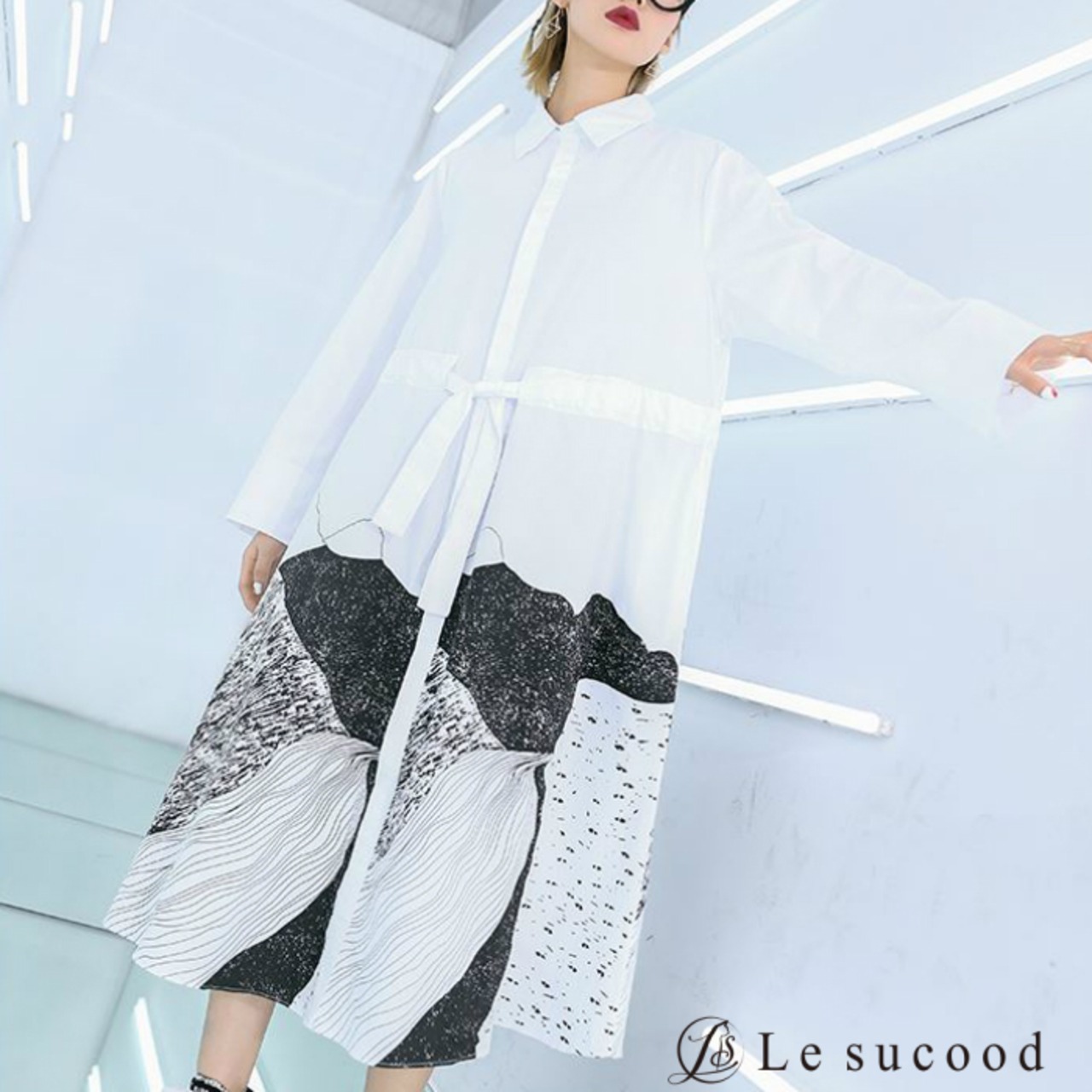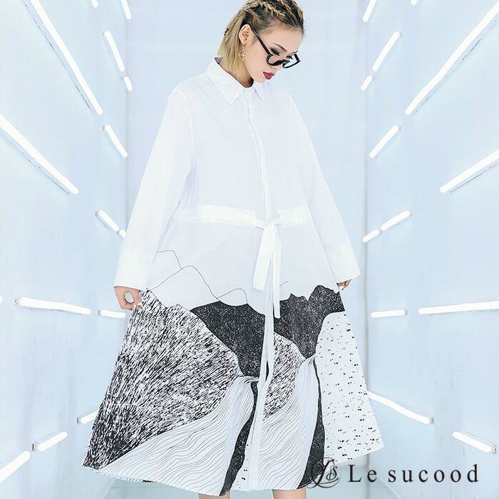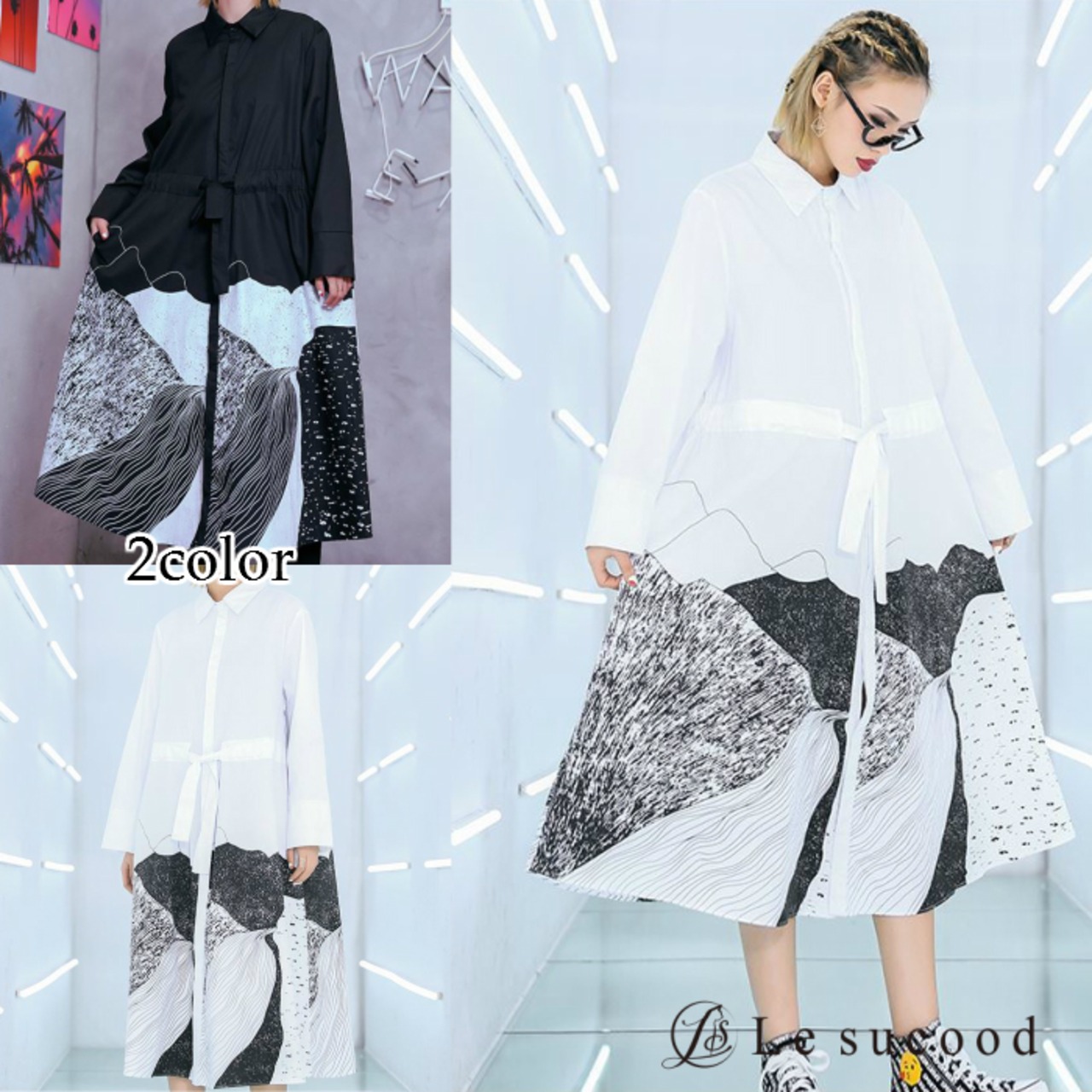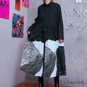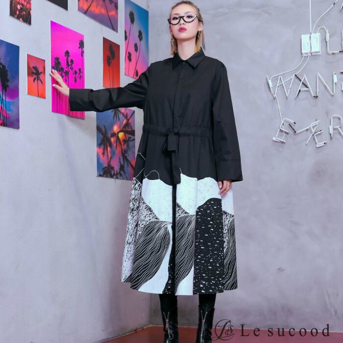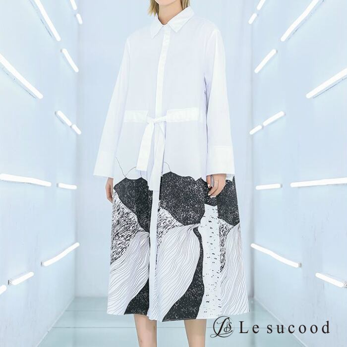 【Le sucood】【お支払い確認後20日以内発送】 切替デザインワンピース シャツワンピース 個性的 モード レディース ロング ブラック ホワイトロングワンピース 手書き風 ペイント 総柄
