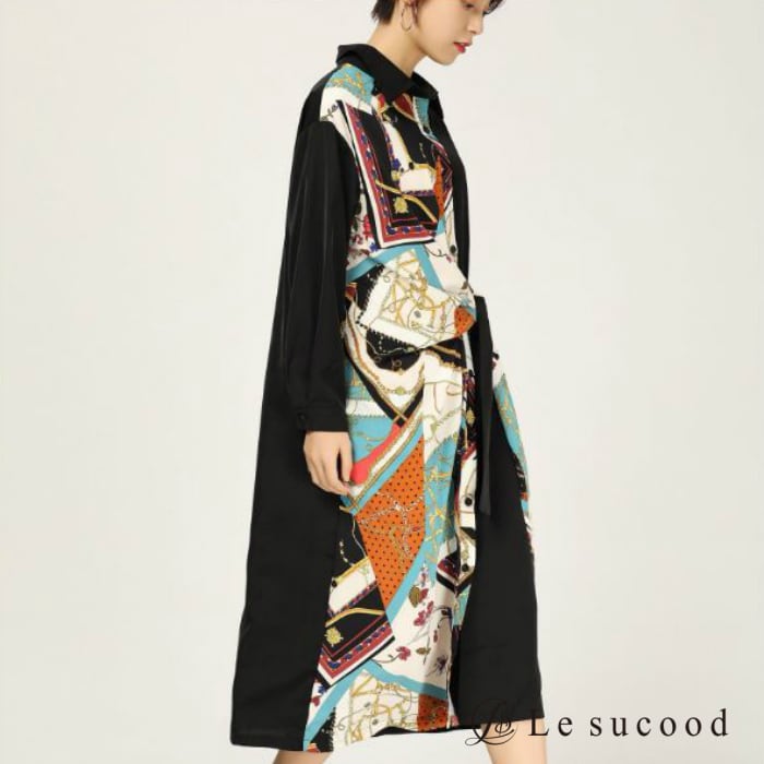 【Le sucood】【お支払い確認後20日以内発送】top218 レトロ調ワンピース エスニック調 ロングワンピース シャツワンピース バイカラー 長袖 ブラック ネイビー プリント デザイン レディース