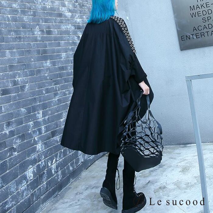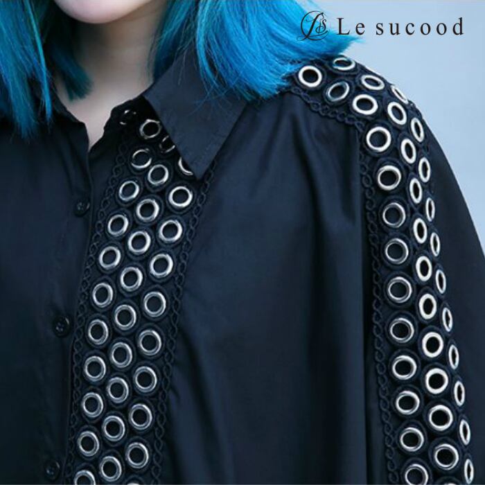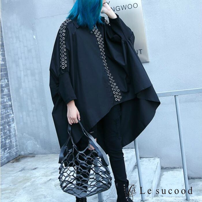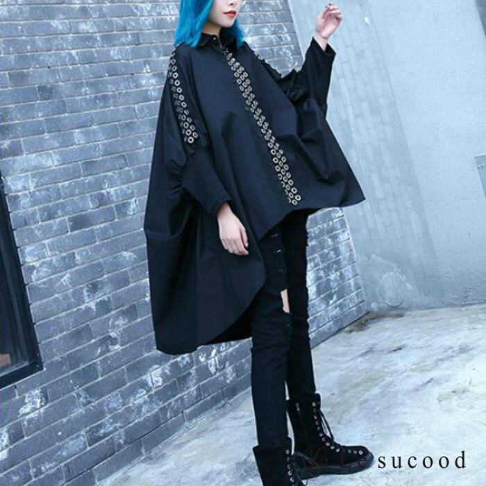 【Le sucood】【お支払い確認後20日以内発送】top220 リングデザインワンピース アシンメトリー シャツ ロックテイスト モード系 ヴィジュアル系 ゴシック レディース ブラック ビッグシルエット オーバーサイズ フレアシルエット