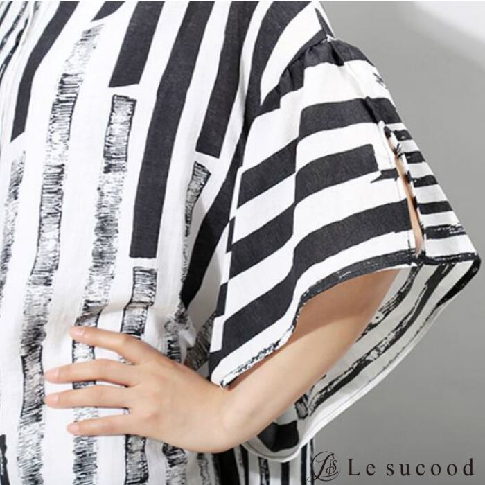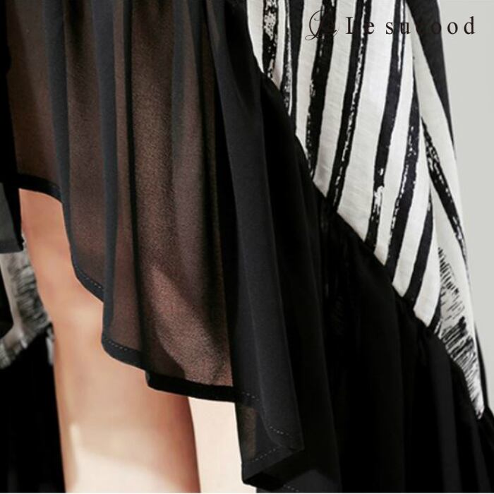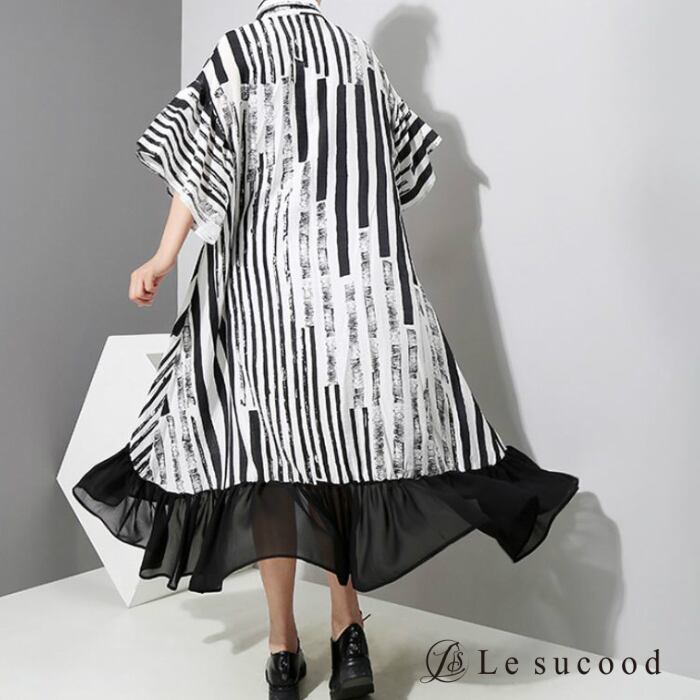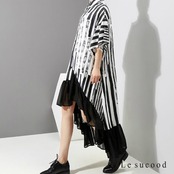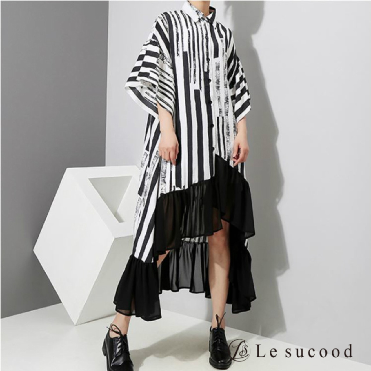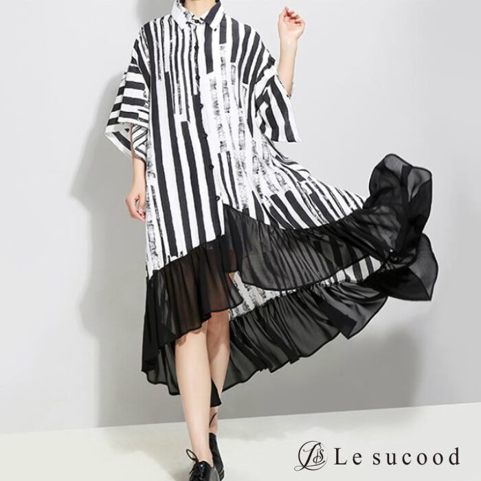 【Le sucood】【お支払い確認後20日以内発送】top227 ストライプワンピース 切替 デザインワンピ アシンメトリー モノクロ モード ストリート ロング 羽織 オーバーサイズ 体型カバー シースルー