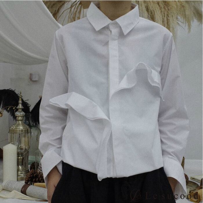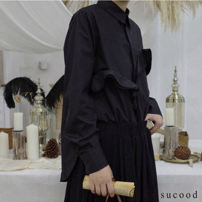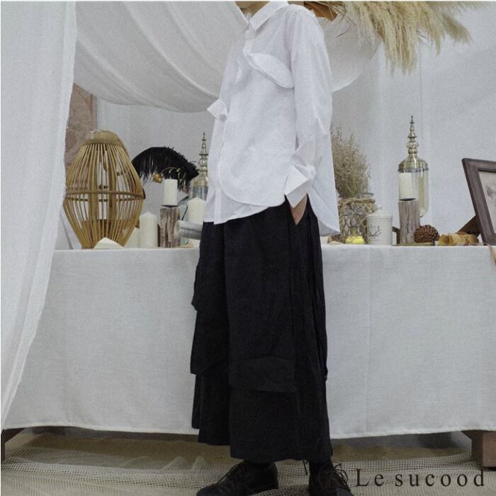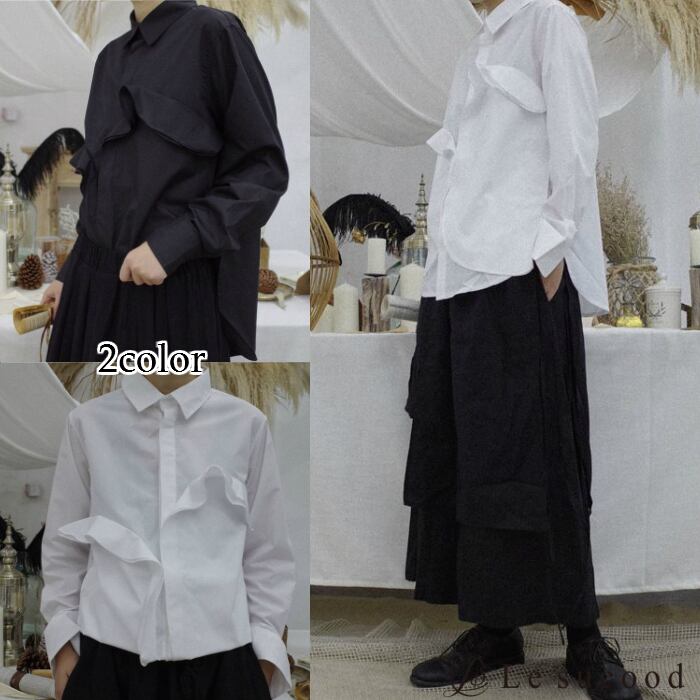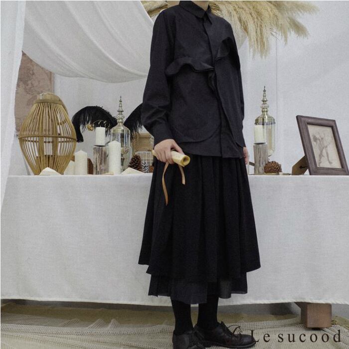 【Le sucood】【お支払い確認後20日以内発送】top238 レイヤード付き 変形シャツ ビッグシルエット レイヤードシャツ メンズ レディース 黒 白 モード系 V系 長袖 ひらひら 大きいサイズ 韓国 原宿系トップス ワイドシルエット