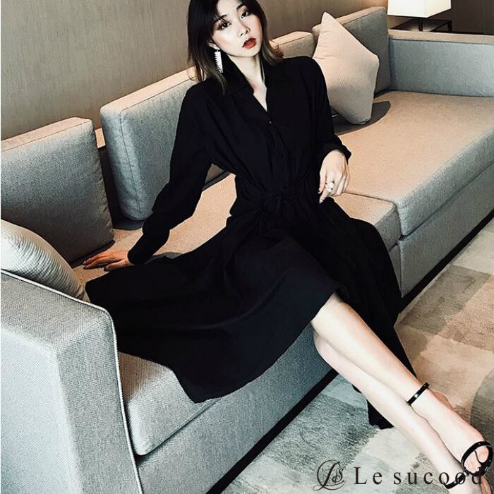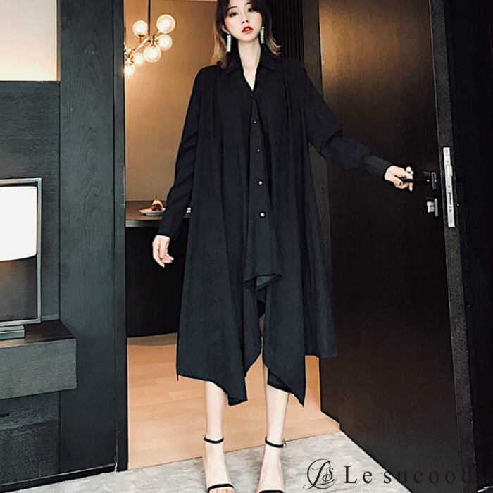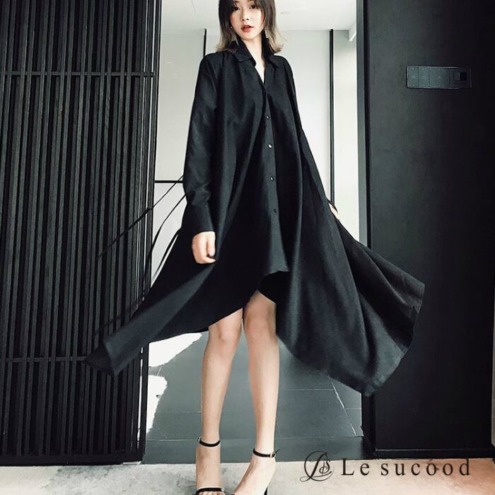 【Le sucood】【お支払い確認後20日以内発送】top239 シャツワンピース アシンメトリー トップス レディース きれいめ 長袖 韓国風 カジュアル モード ゴシック ワンピ ロング丈 2019年 ロングシャツ 膝丈 通勤 ゆったり オールシーズン 黒 白 ブラック ホワイト